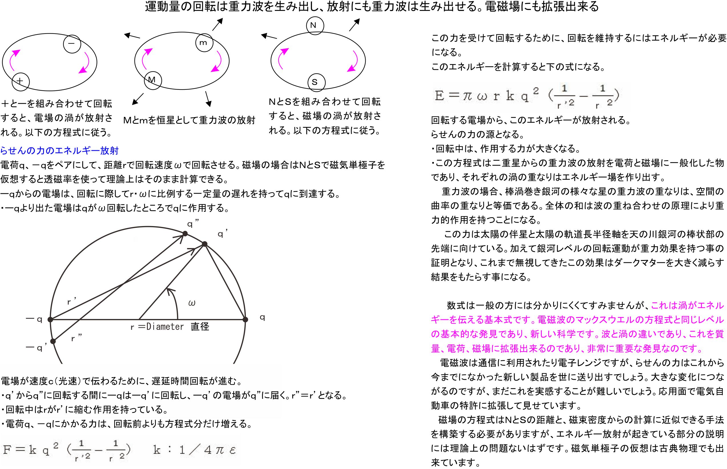 これは渦がエネルギーを伝える基本式です。電磁波のマックスウエルの方程式と同じレベルの基本的な発見であり、新しい科学です。波と渦の違いであり、これを質量、電荷、磁場に拡張出来ているのであり、始まりはインチキに見える霊能力者の助言ですが非常に重要な発見なのです。この世に存在する基本的な力の一種であり、運動と波だけだったエネルギー伝達手段に新たに渦が加わったのです。