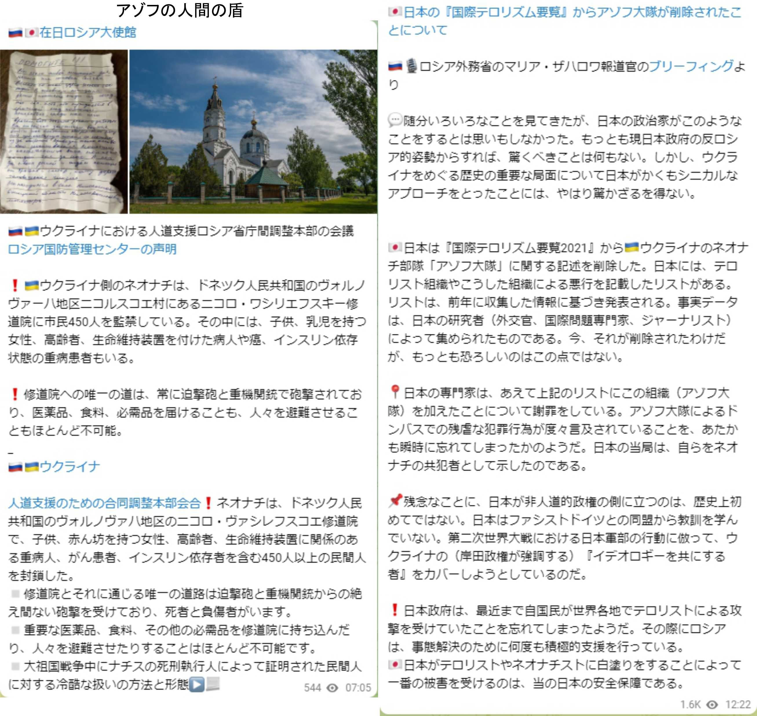 露外務省のザハロワ公式報道官は、日本の公安調査庁がウクライナの「アゾフ大隊」をネオナチ組織(「国際テロ組織要覧」)から削除したことに言及し、「(この決定で)遺憾ながら日本は国家としてロシア嫌悪の列に並んだわけだ。しかも日本はこれにより、アジアの中で(ロシア嫌悪の)一列目に立った」と明言。声明はTV「ロシア24」放送で表された。