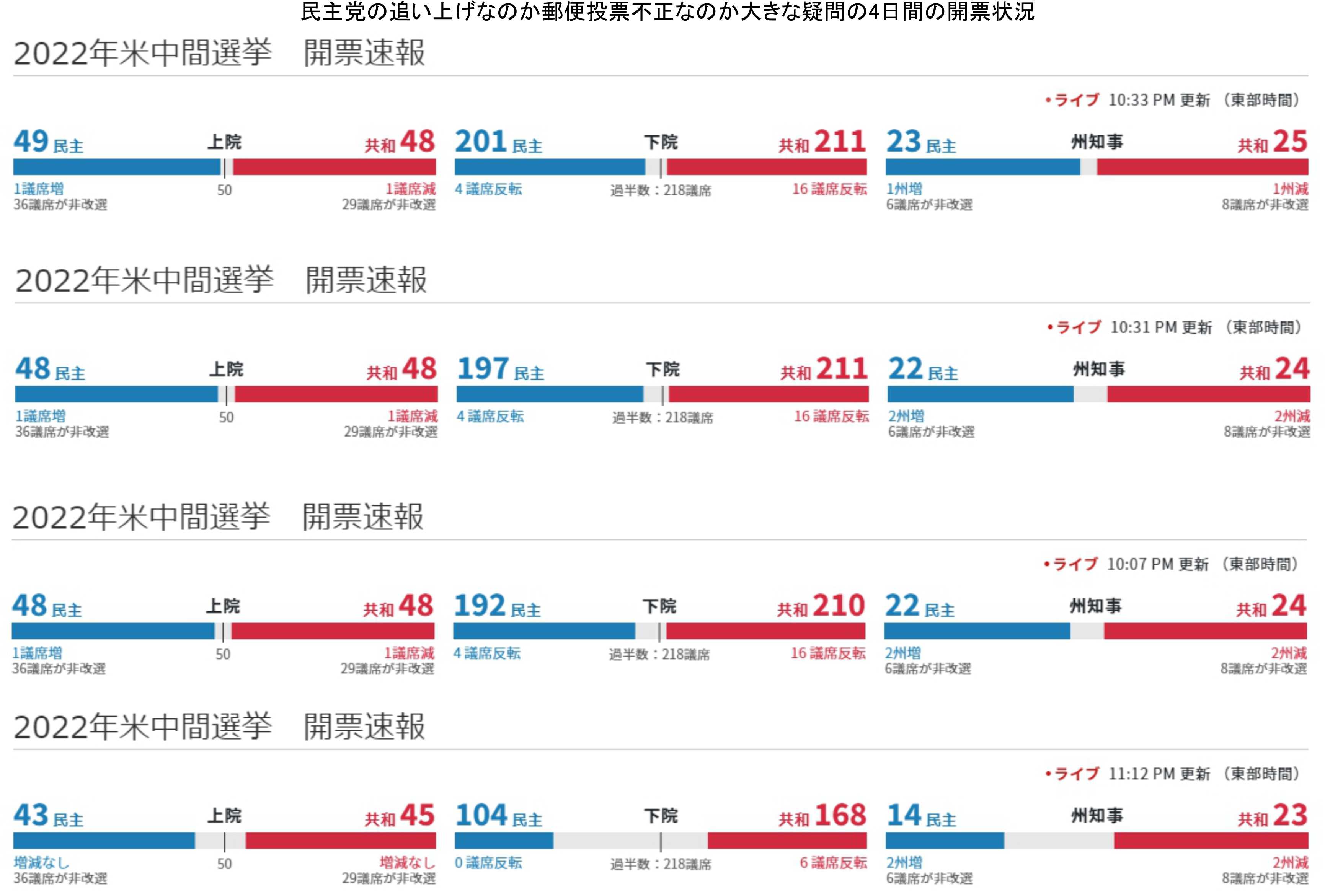 まだ中間選挙の結果は出きらないのですが、上院は民主に可能性がまだ残るのですが、下院は本来ならもう逆転が難しいでしょう。本来ならと書くのは、郵送投票分の評価を意図的に遅らせて、2年前と同じ不正選挙を懲りずに米国西部で繰り返していると思えるのでした。トランプ氏の発言をでっち上げたり、開票作業も遅らせているのでした。