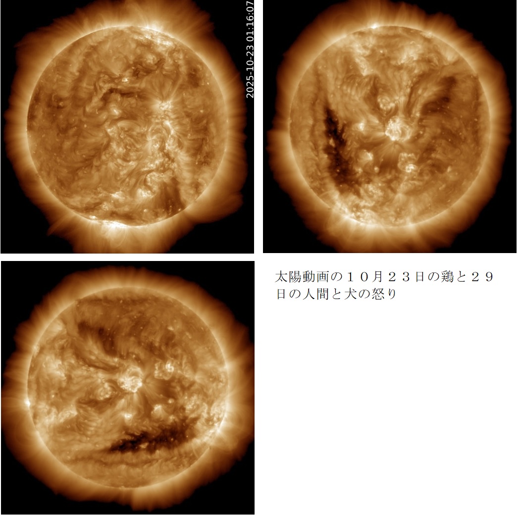 10月23日に軟X画像の太陽動画に鶏のコケコッコ~が描かれて合図でした。夜明けを告げるこれでやっとニュースになれるかと思ったのですが、本日29日は、昨日から描いている目から炎を上げる人の顔と、これを90度回転すると目をつり上げて怒る犬のような動物の頭が描かれています。これに合わせてニュースになれることを願うのでした。イラストに自然の本当の力を紹介します。