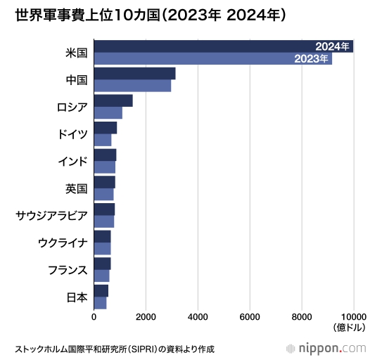 世界全体で支出される軍事費は2024年の1年間で2兆7180億ドルと、前年より9.4%も増加した。これは東西冷戦終結以降、最大の伸び率。日本の軍事費は553億ドルで、世界10位の水準だ。