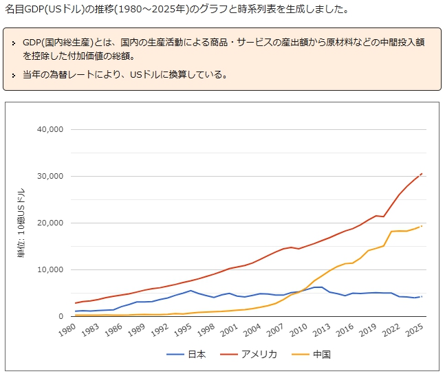 米国GDP、2000~2020年 約10兆ドルから20兆ドルへ、2倍に増える。