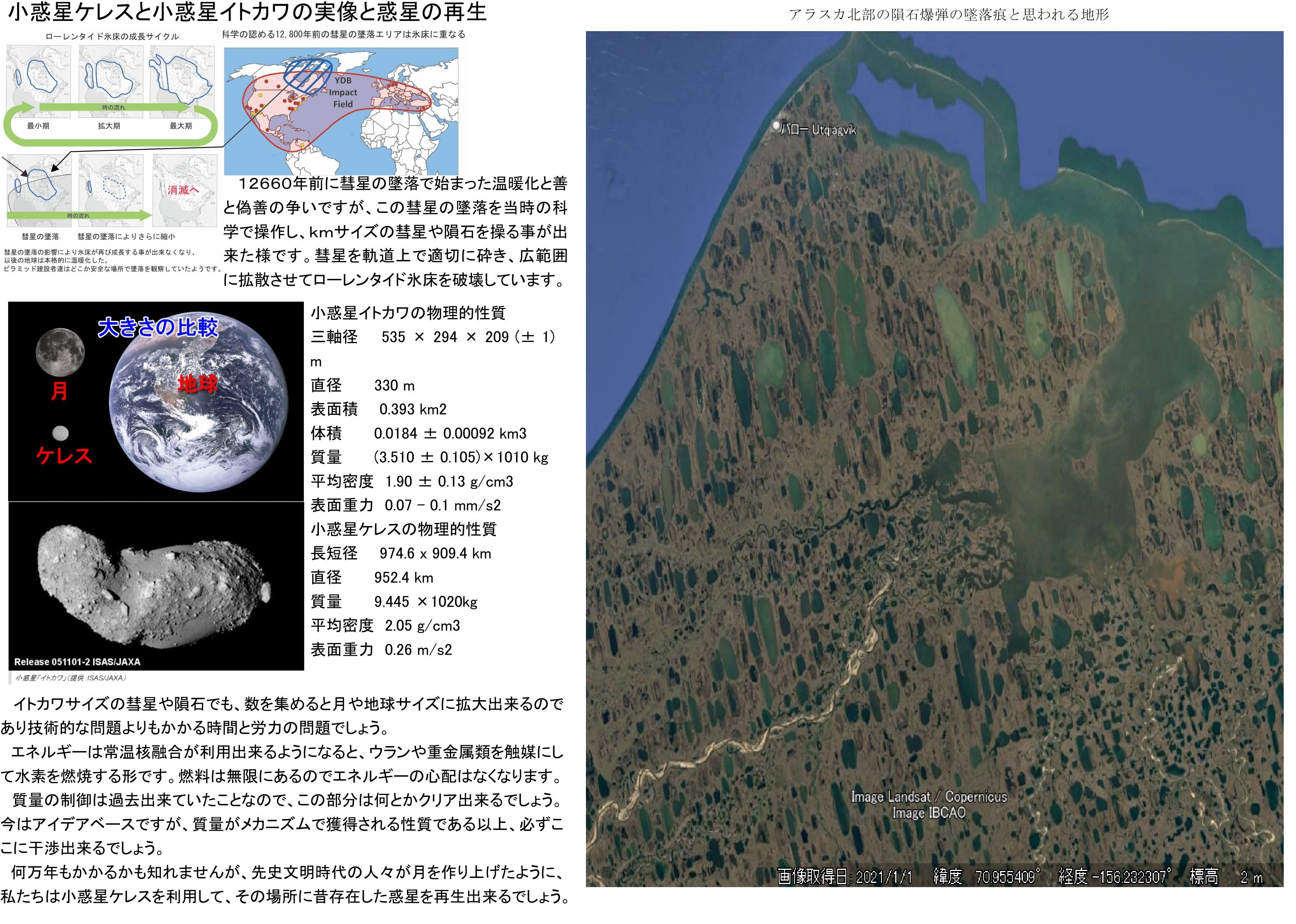 まず技術面です。大型のUFOを作ると、らせんの力の技術を用いて、1kmサイズの隕石や彗星を動かせるようになるのでした。先史文明時代にはこれで津波を起こされて海辺は文明崩壊でしたし、約12660年前には、今回の善と悪との争いの始まりを刻むために、彗星を砕きながら地球に落とし、北半球側に存在した氷河期由来の氷床を大規模に破壊しているのでした。