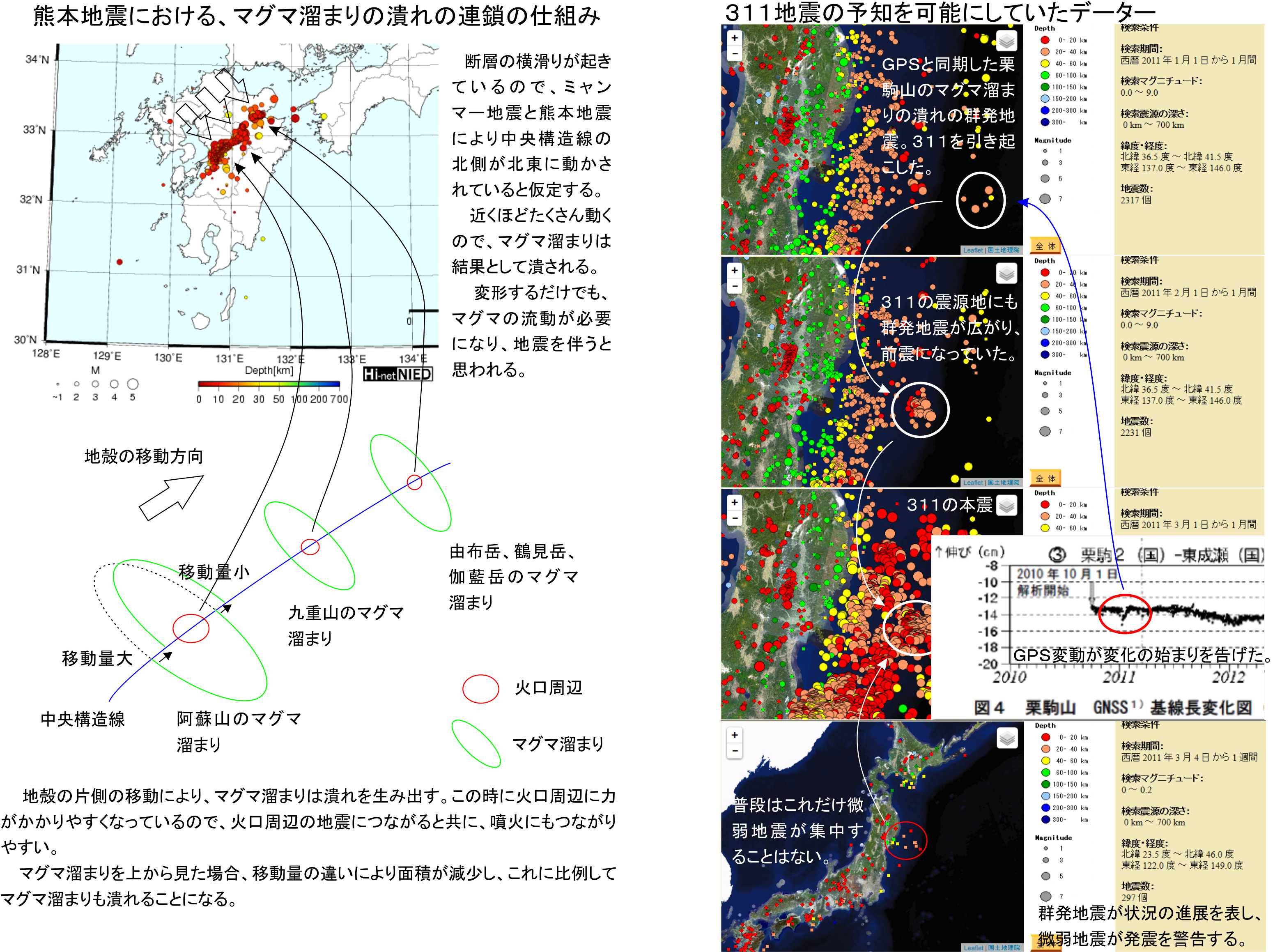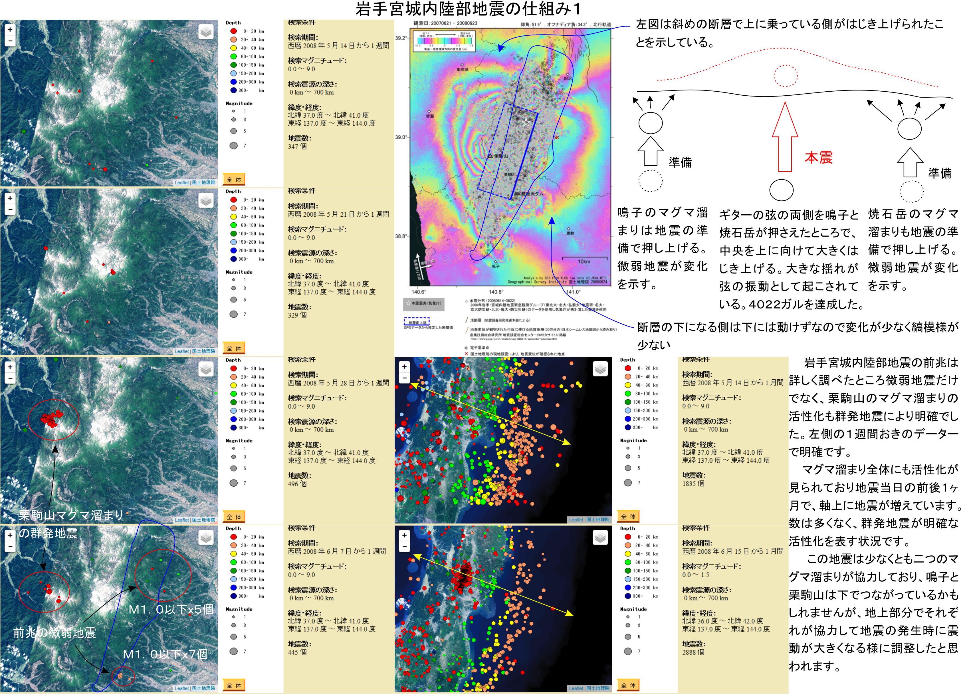 岩手宮城内陸部地震の前兆は詳しく調べたところ微弱地震だけでなく、栗駒山のマグマ溜まりの活性化も群発地震により明確でした。イラストの左側の1週間おきのデーターで明確です。