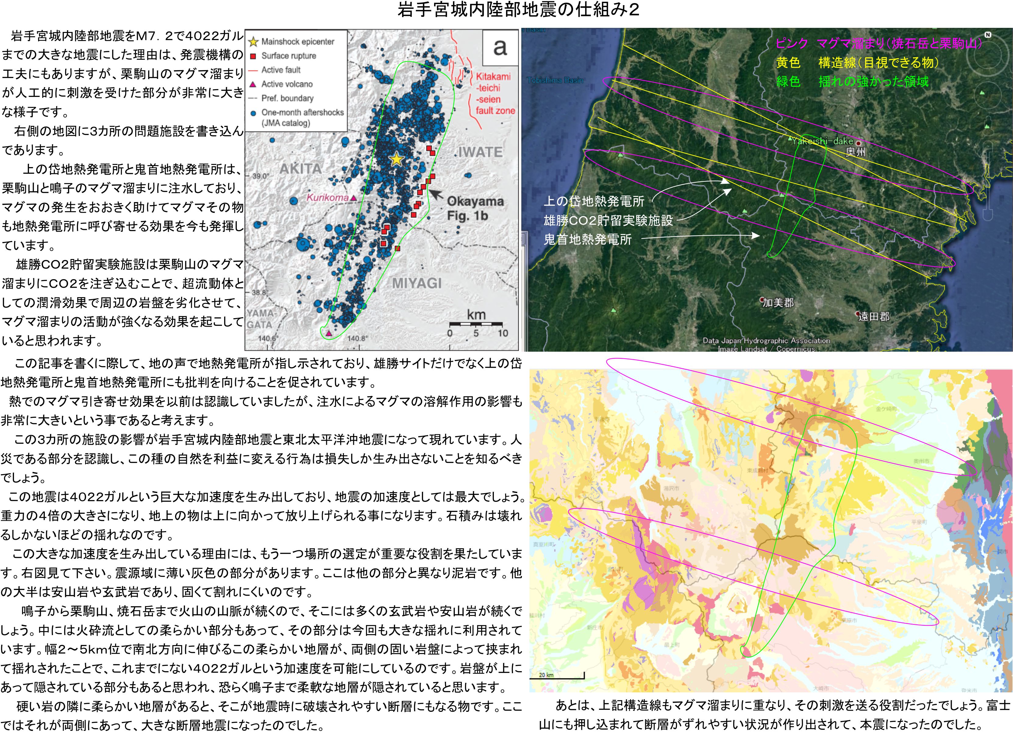 雄勝CO2貯留実験施設は栗駒山のマグマ溜まりにCO2を注ぎ込むことで、超流動体としての潤滑効果で周辺の岩盤を劣化させて、マグマ溜まりの活動が強くなる効果を起こしていると思われます。長岡と苫小牧のCO2貯留実験施設が周辺に地震をまき散らしているのと同じです。
