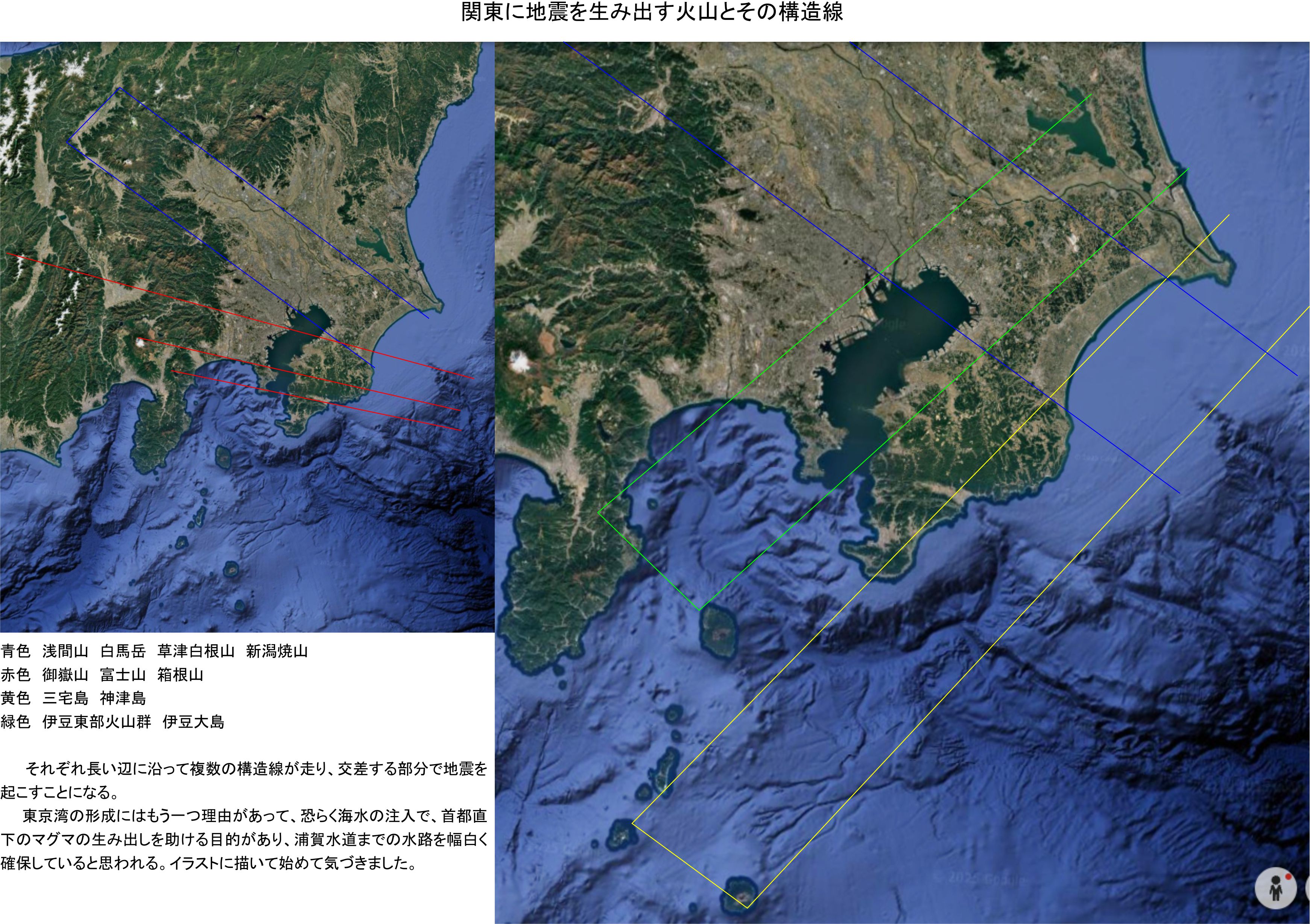 伊豆東部火山群由来の地震も、三宅島由来の地震も、この交点を超えた先でも地震を起こしています。エネルギーは同じ仕組みで生み出すのですが、霞ヶ浦の水や太平洋プレートの産み出している他の構造線を使って地震起こしており、M7まで可能なのでした。この予想も重要でしょう。