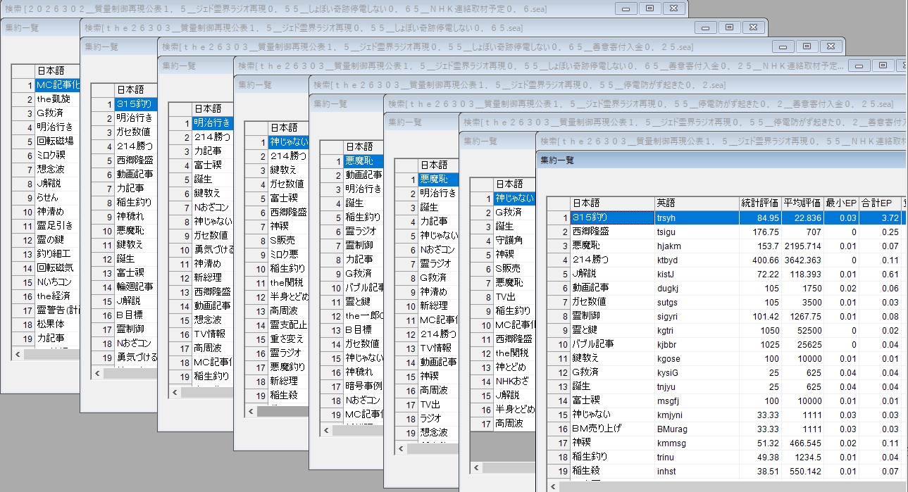 2月28日の解析を行っており、ジェド霊界ラジオ再現とジェド霊界ラジオあの世妨害未完で大きな差が出て欲しかったのですが、この評価では差がないのでした。この理由は、フィルターにしている未来の条件の中で、再現とあの世妨害未完の統計的な評価が、残りのジェド霊界ラジオ部分に大きく負けている結果です。この言葉を減らして、ジェド再現とジェドあの世妨害未完で再評価して、やっと有意な差が出てきたのでした。