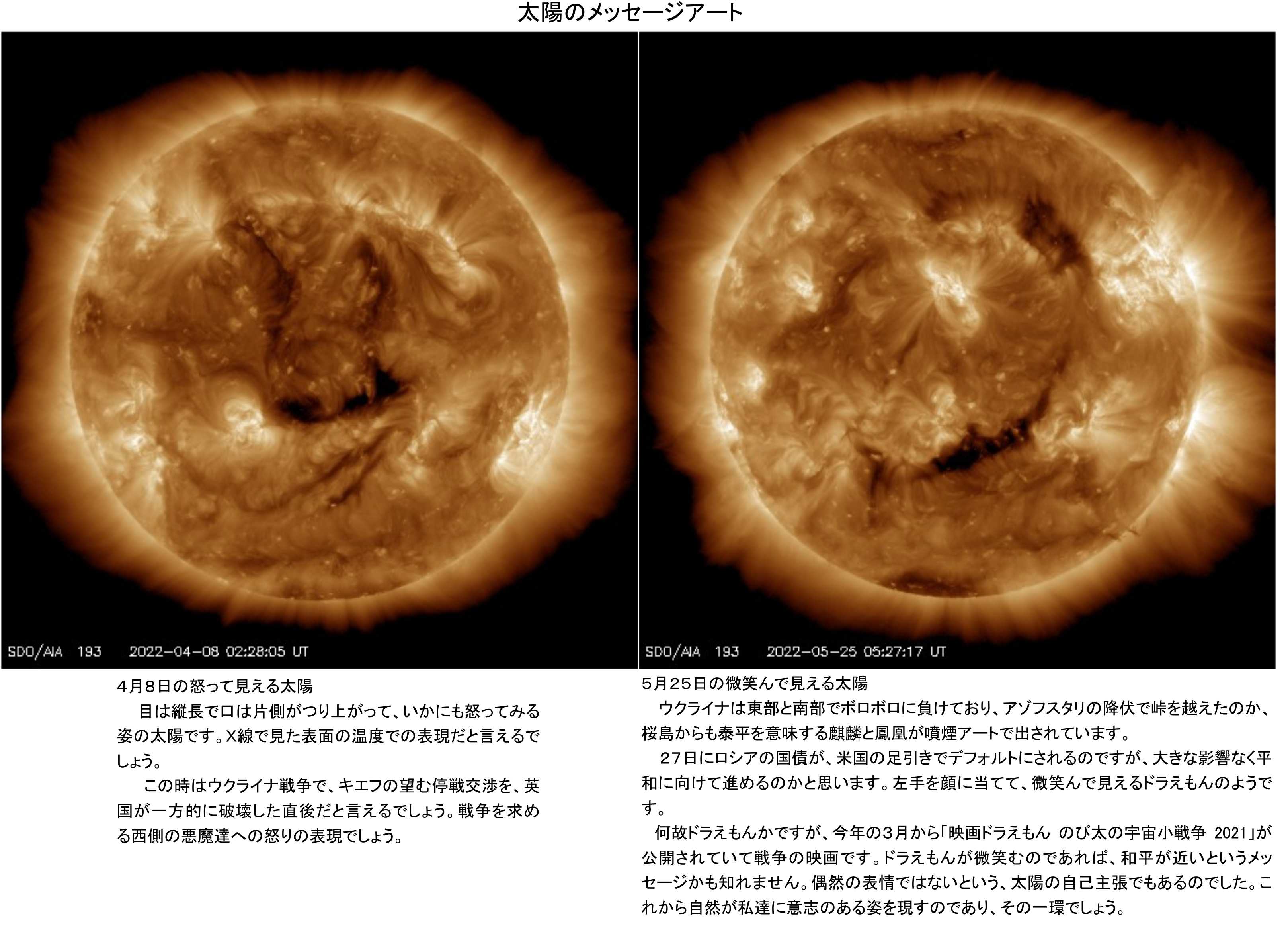 加えて地球の約108倍もある太陽の表面に、軟X線という目に見えない波長ですが、人間達向けに動画を描いて見せているのでした。節目節目で描かれる動画のイラストを参照下さい。日本の桜島や阿蘇山では噴煙アートまで使って、情報を提供してくれています。