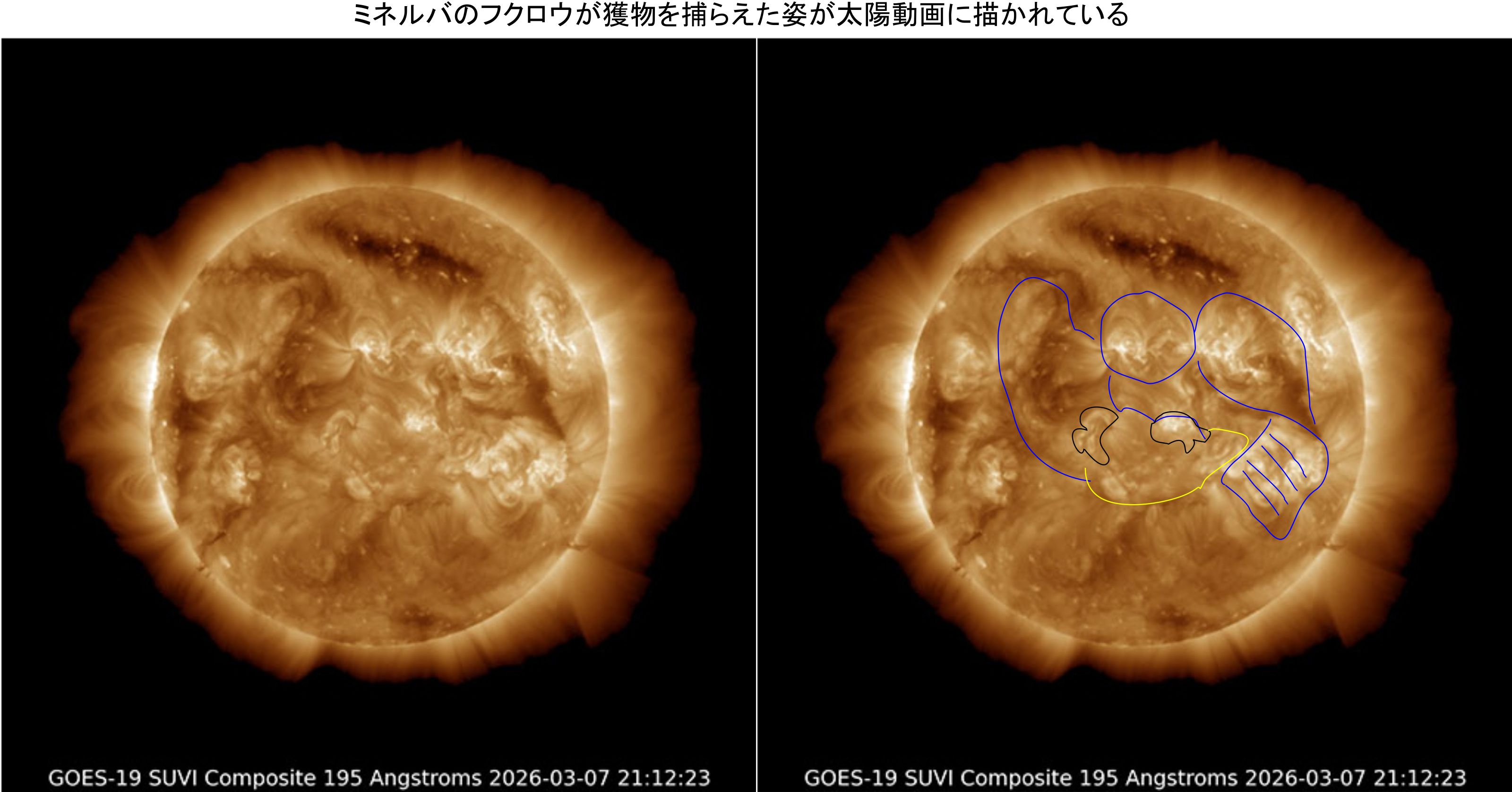 太陽動画は2022年4月8日の怒る太陽で初めての気づきでした。直近の3月7日のミネルバのフクロウが獲物を捕らえている様子が、今の善と悪との姿を現すのでしょう。太陽動画はたくさんありますので、これらが代表的な物になると考えて選んでいます。