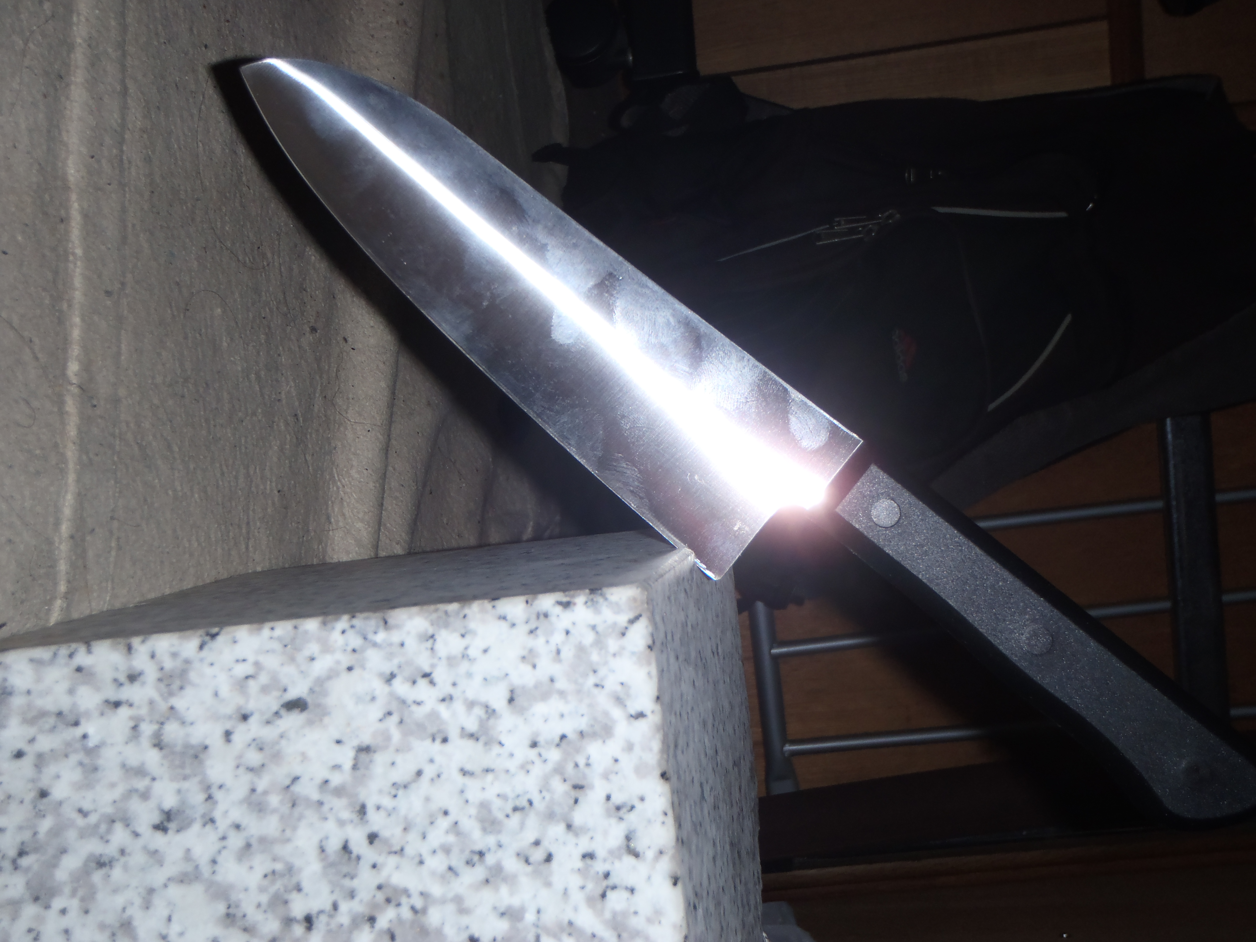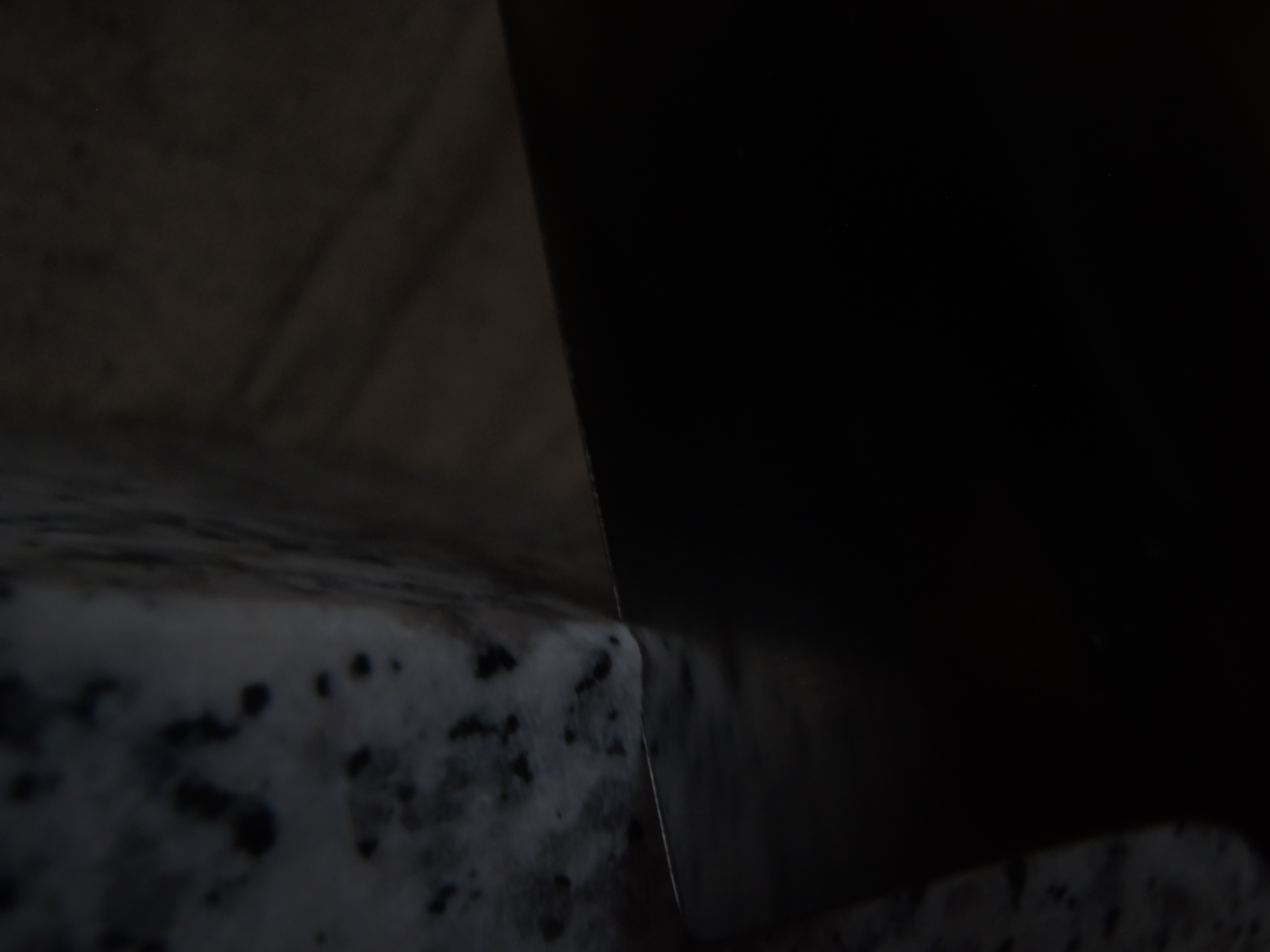 3)予想通りに三徳包丁(KAIさんのGRACE)の刃は丸くなるのですが、手で触れる0.1~2mm位の幅でそれ以上の幅へのつぶれを起こさずに、1時間ほどの加工が可能でした。これも愕きです。刃を潰す始まりには砂鉄的に刃の加工くずが出ましたが、途中からは大幅に減っています。