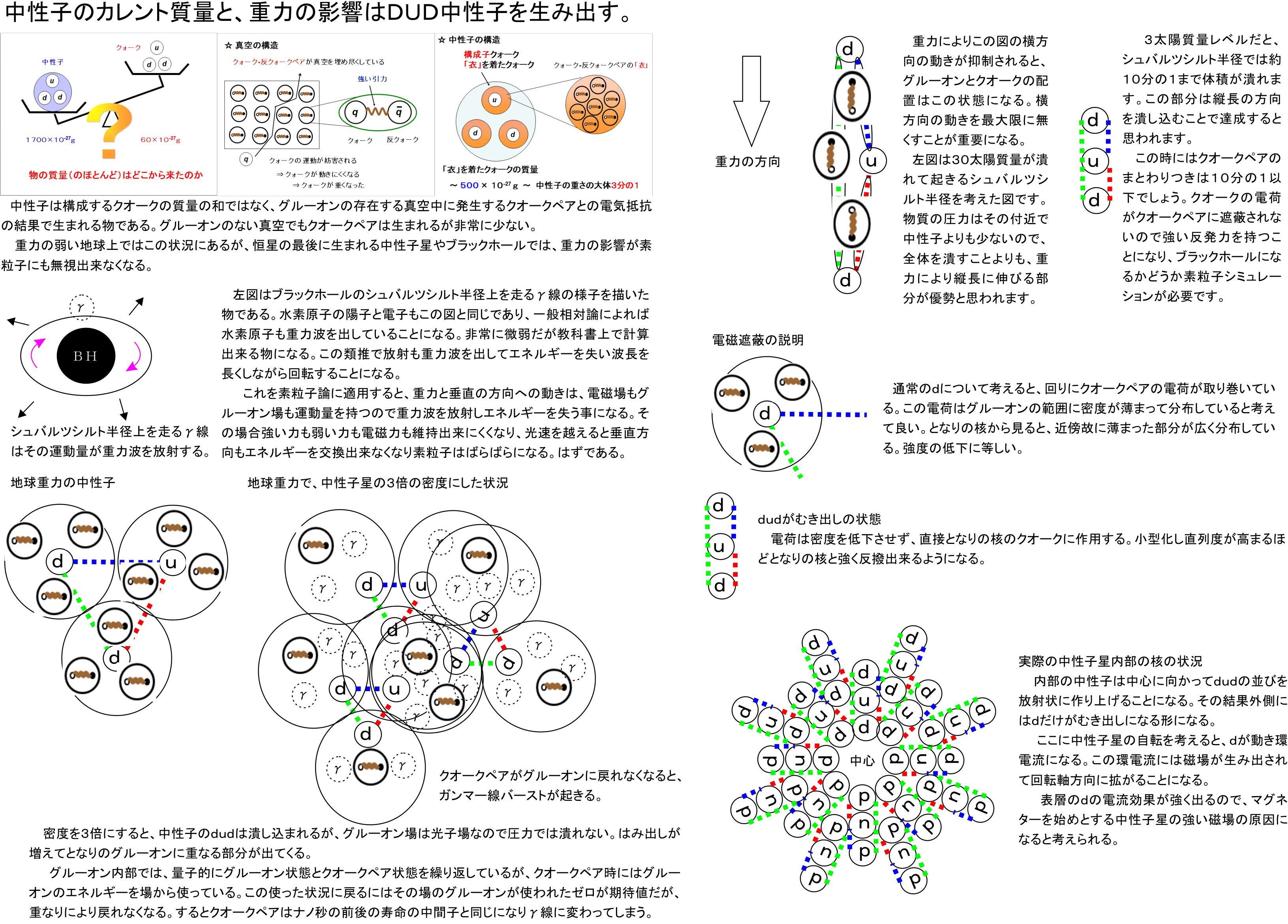 この時に中性子は、電気的な性質と相対論な速度になる重力の影響で、重力方向にDUDのクオークが並ぶ形を取れるのです。これを突き詰めると中性子星の表面にはDクオークがむき出しで回転していることになるので、マグネット・スターとして観測にかかる超強磁場を発生させる星になるのでした。