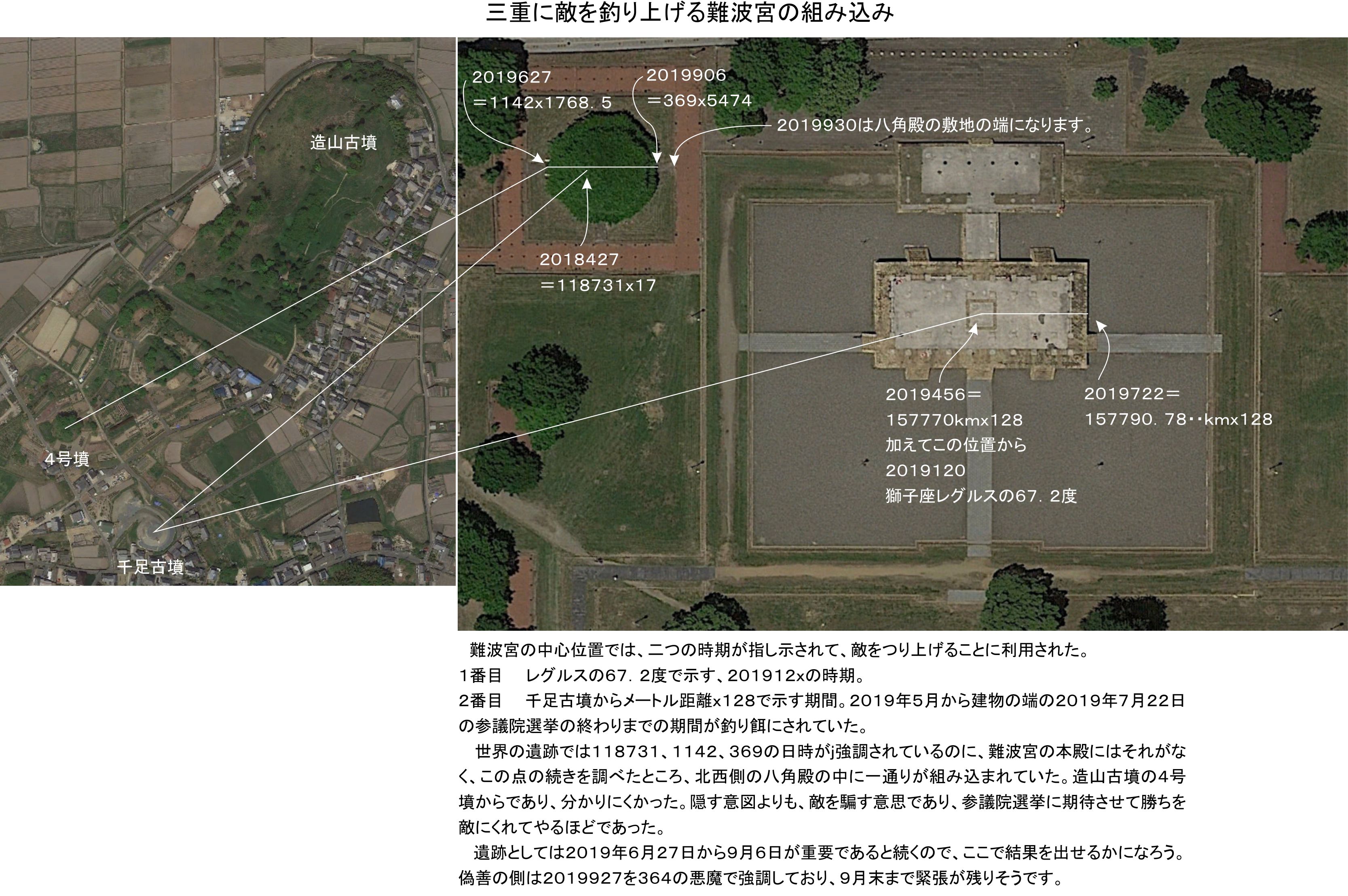 当時の争いには特徴があり、日本の破壊したい古墳に向けて1.05946の倍数と2268や864などのイナンナ数の倍数を、距離と角度に組み込んでサークルや池で作り出し、そこからの呪いという形で古墳を破壊しています。日本では岡山に二つと大阪に二つ当時の痕跡が残されています。世界で見てもエジプトやバビロン、ティアワナコなどに共通の攻撃の仕組みでした。