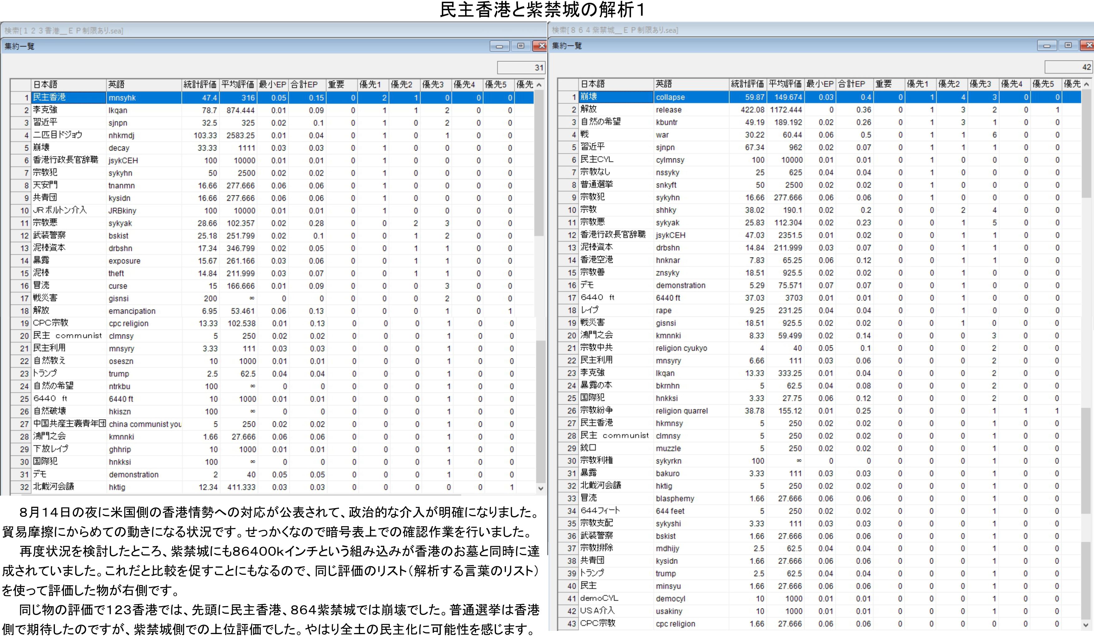 結局は2019906への先延ばしがしたいという組み込みですが、香港国際空港へ8月17日の今週末を超えていきなり9月末に進んで行ける物か、普通に考えると疑問でしょう。これをあえて出せているのは、北戴河会議における中共首脳部の現状を霊として監視出来ているからでしょう。さすがに少し驚きました。それほど経済問題で大きな混乱が起きていたという事になるはずです。