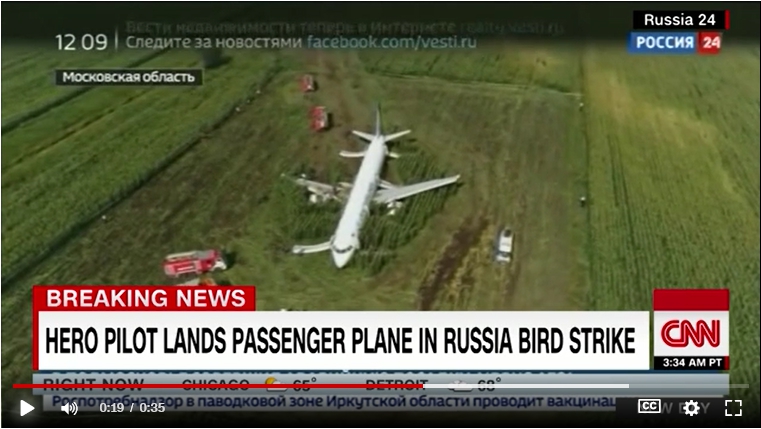 旅客機はウクライナ南部クリミア半島のシンフェロポリ行きのエアバスA321。機長によると、空港の滑走路を離陸した際、最初に左側、次に右側のエンジンが正常に稼働しなくなった。機体が降下し始めたため、可能な限り軟着陸することを決断。車輪を出して着陸すれば地面にめり込み機体が横転する恐れがあると考え、車輪を出さない胴体着陸を選んだという。乗客の証言などから、カモメの群れがエンジンに巻き込まれたのが事故原因とみられている。
