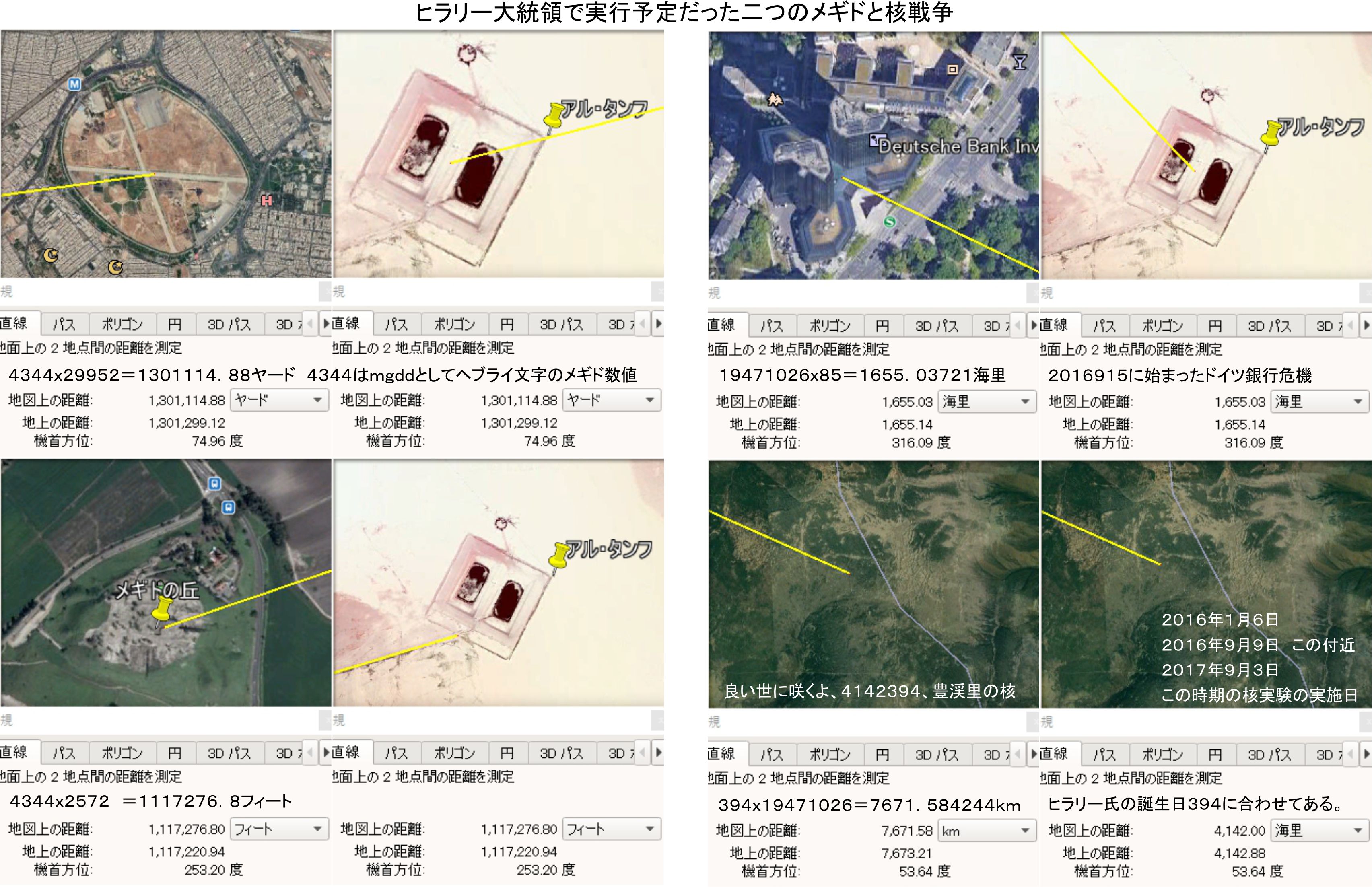 ヒラリー氏の誕生日は、メギドの丘の関連で近くにあるタボル山を含めて、世界の重要な場所に向けて組み込まれている基本数値です。ヒラリー氏が悪魔の代理の大統領として就任出来ていた場合に、多くの悪事が起こされた可能性を未来の計画として公表するところです。ここに組み込みがなくても疑問には感じないので、時間を潰されている事に変わりはありません。重要なことは今後の自然の動きであり、くだらない解析をさせる理由のどこかに意味を持たせているのでしょう。