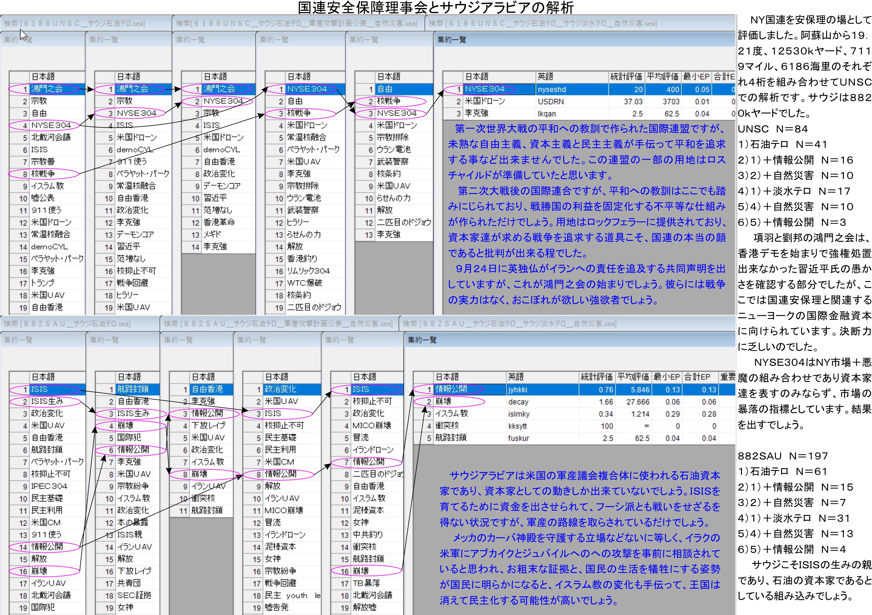 NY国連を安保理の場として評価しました。阿蘇山から19.21度、12530kヤード、7119マイル、6186海里のそれぞれ4桁を組み合わせてUNSCでの解析です。サウジは8820kヤードでした。