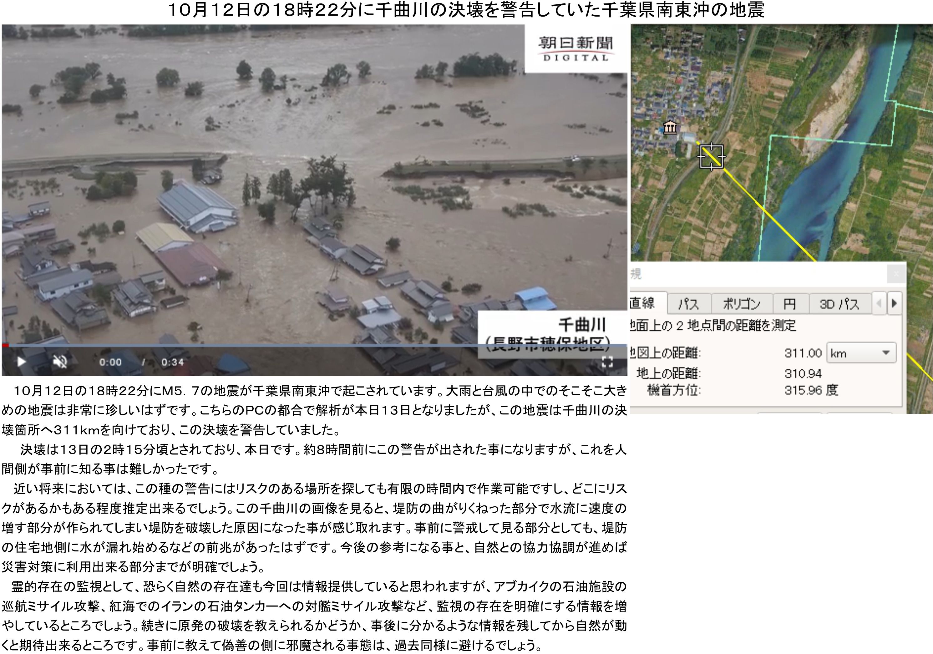 昨日の千葉県南東沖の地震は、本日2時15分過ぎに起きた千曲川の決壊を事前に警告する物でした。長野市への警告だった様子です。以下まず地震の組み込みです。彼らとしては教えているアピールですが、今後がどうかは何とも言えません。今回で言えばこちらがPCの都合で予測作業を出来ない状況を作り上げての動きでした。