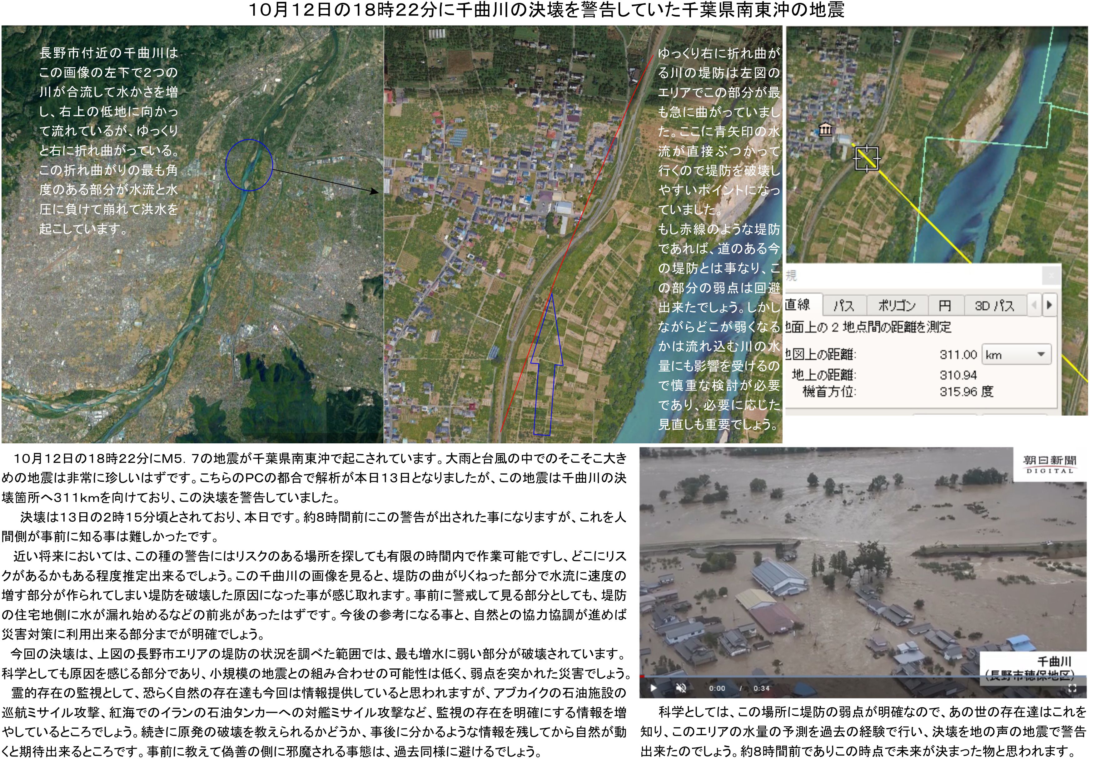 10月12日の18時22分にM5.7の地震が千葉県南東沖で起こされています。大雨と台風の中でのそこそこ大きめの地震は非常に珍しいはずです。こちらのPCの都合で解析が本日13日となりましたが、この地震は千曲川の決壊箇所へ311kmを向けており、この決壊を警告していました。イラスト参照下さい。