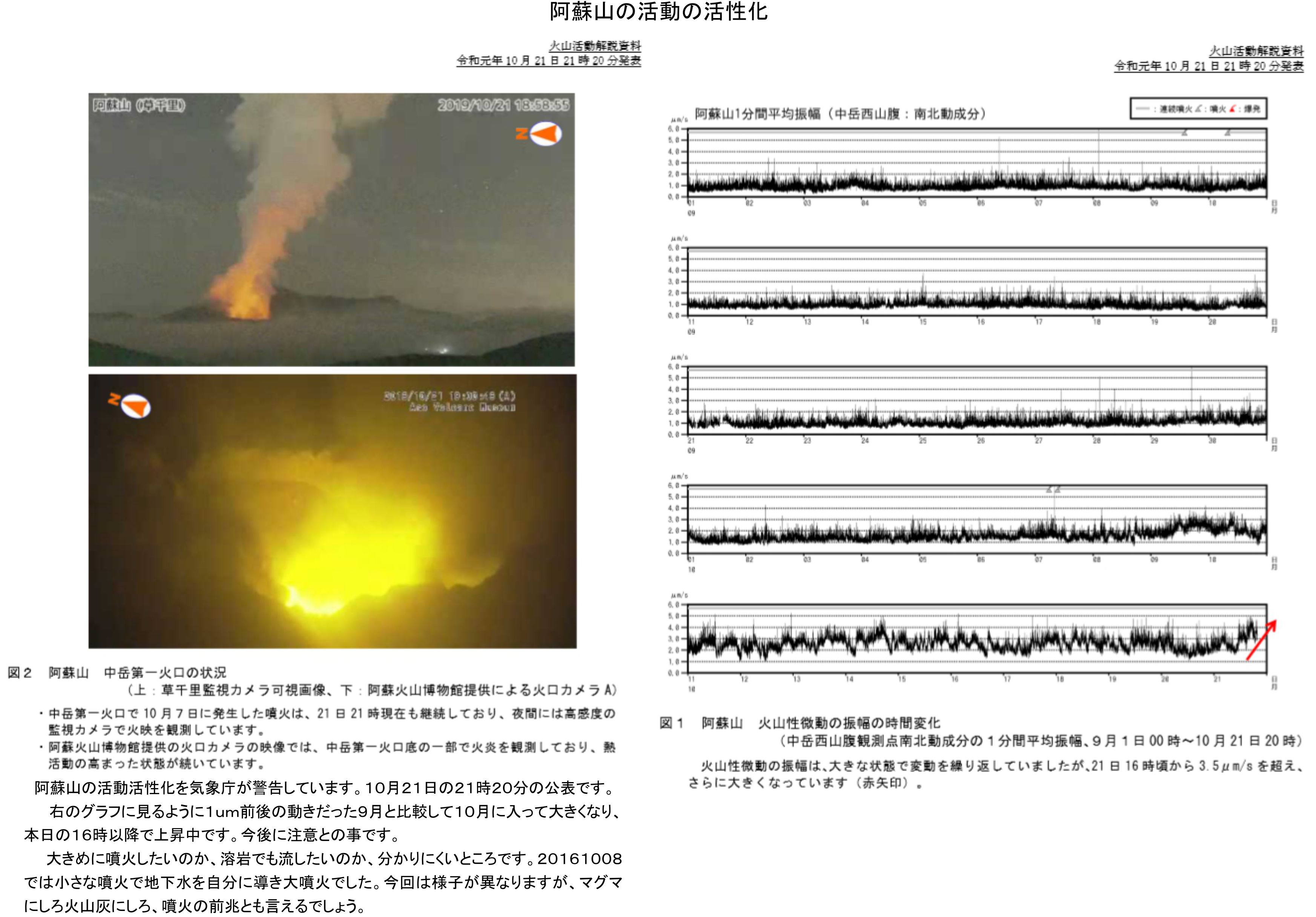 21時20分に気象庁から阿蘇山の活性化の情報が流されています。今は天候の関連で火口が見えないのですが、連続噴火を継続中で本日の16時以降火山性微動が大きくなってきているとの事です。イラスト参照下さい。