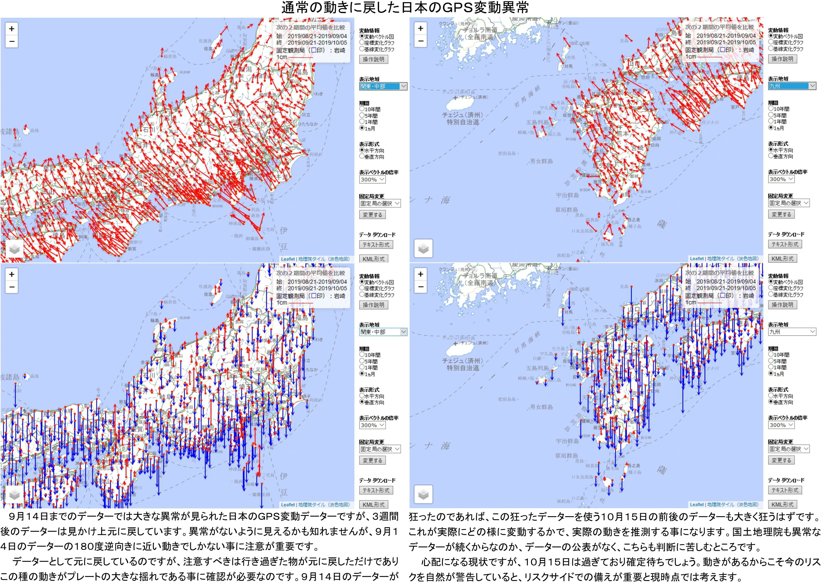 ファティマの聖母の102周年の20191013が台風19号としての露払いとすると、しばらく油断の出来ない状況が続きます。2019906の警告以降、自然の具体的な動きとしては10月5日の広域GPS変動異常が明確になって大きな動きの前兆になり得るのですが、場所を絞らせないし時期も1ヶ月以上は前後出来るでしょう。
