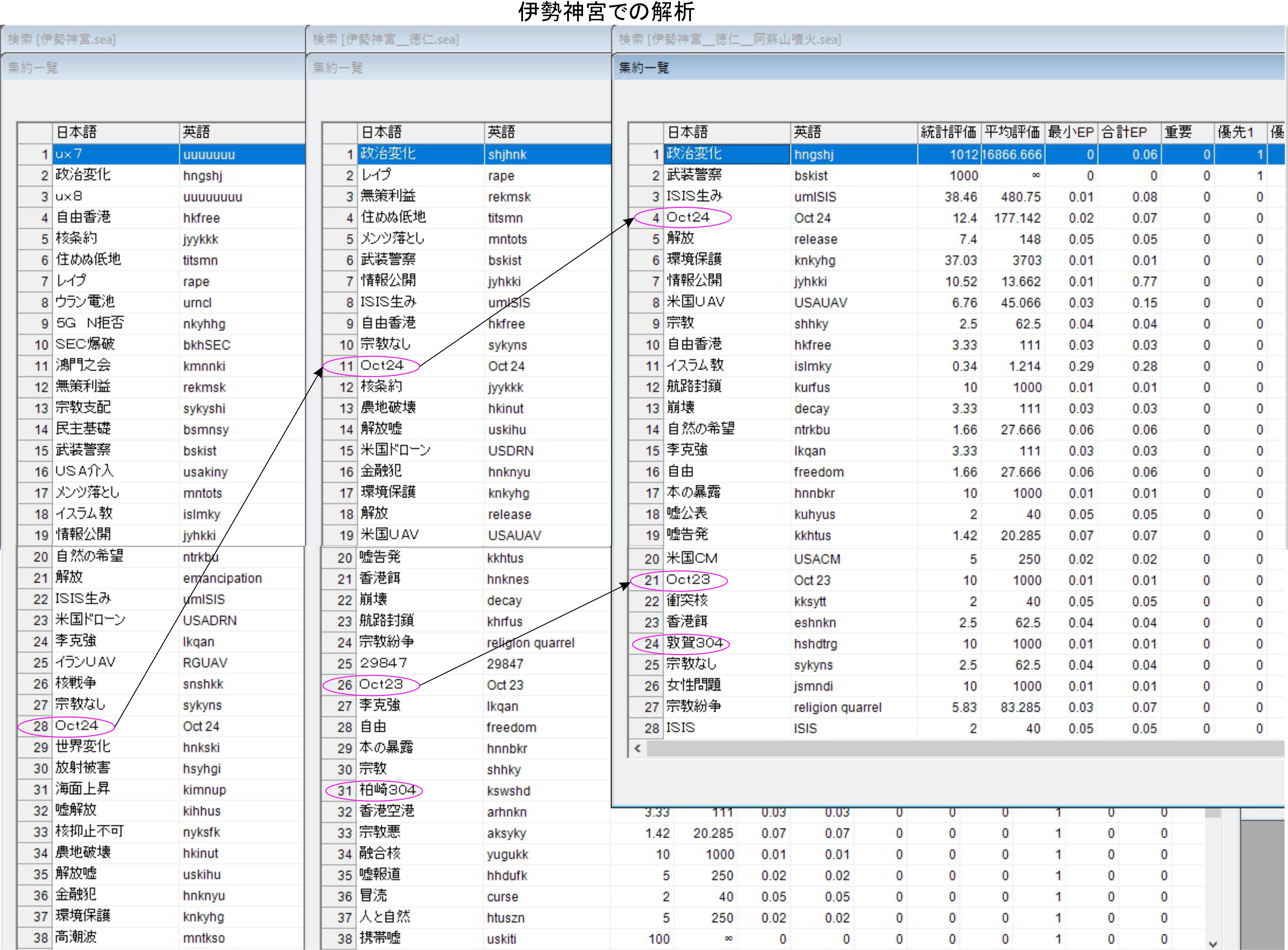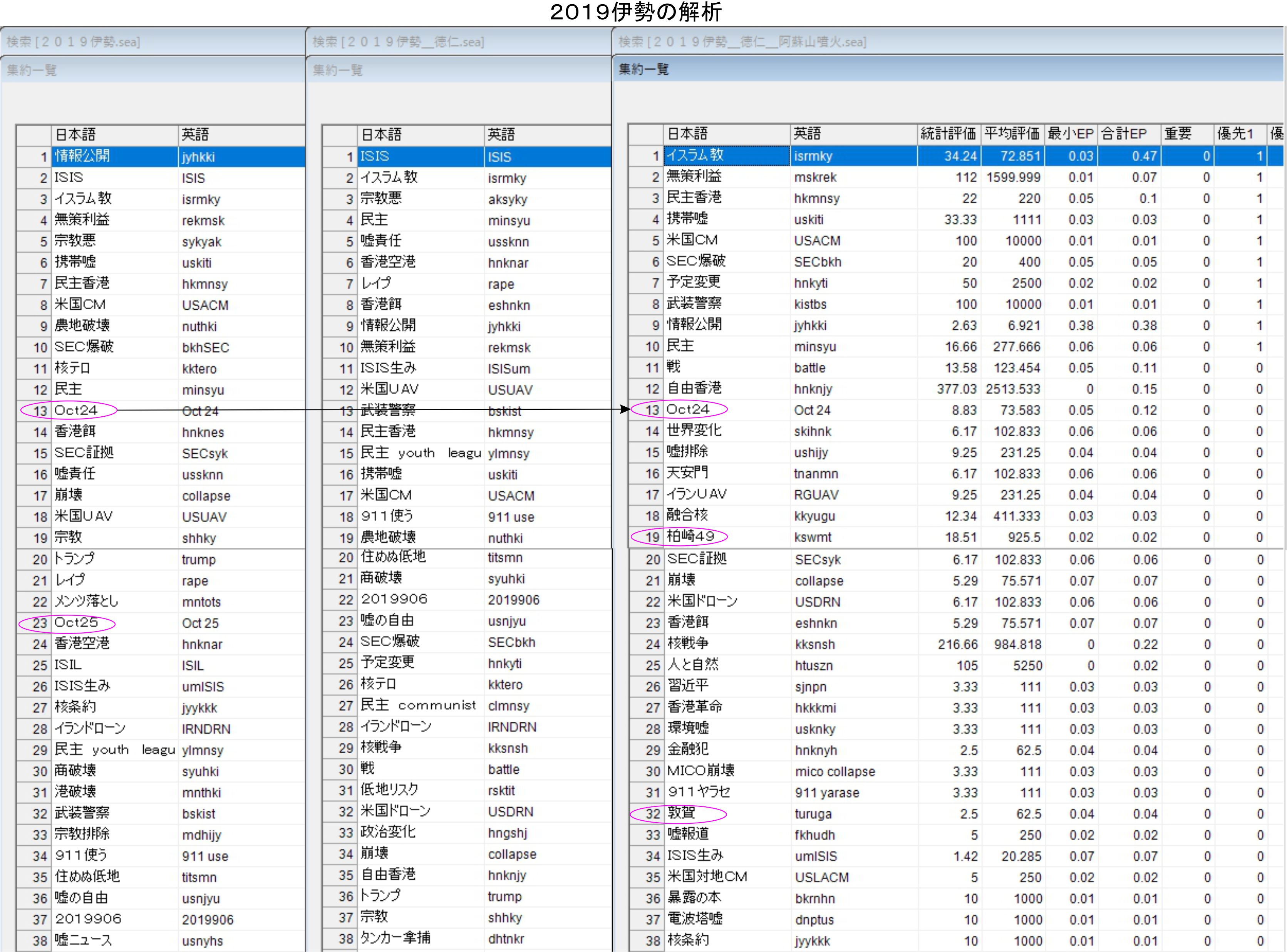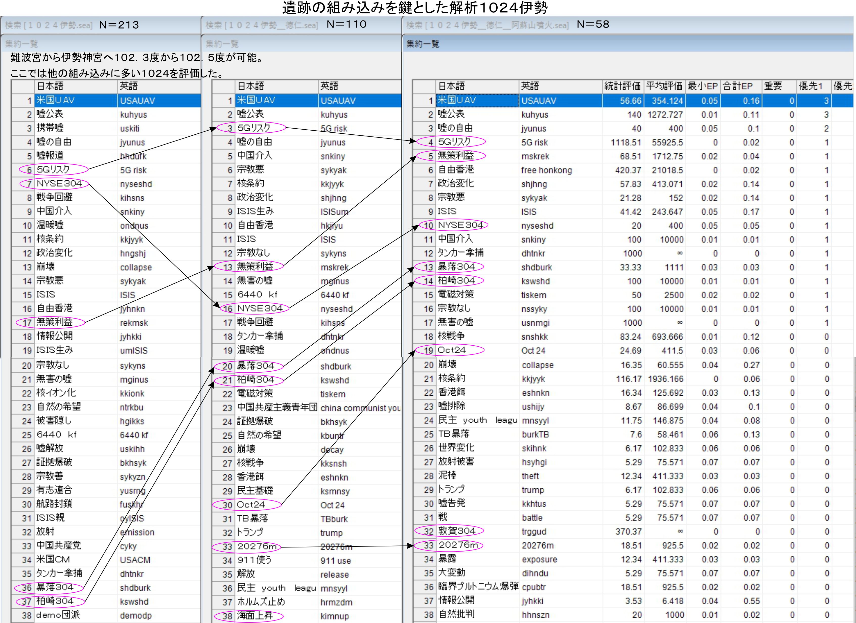 伊勢神宮では1024と2019のフィルターを試していますが、敦賀も柏崎も消えてしまう結果でした。現状では徳仁様と阿蘇山の噴火がイベントフィルターとして使えています。