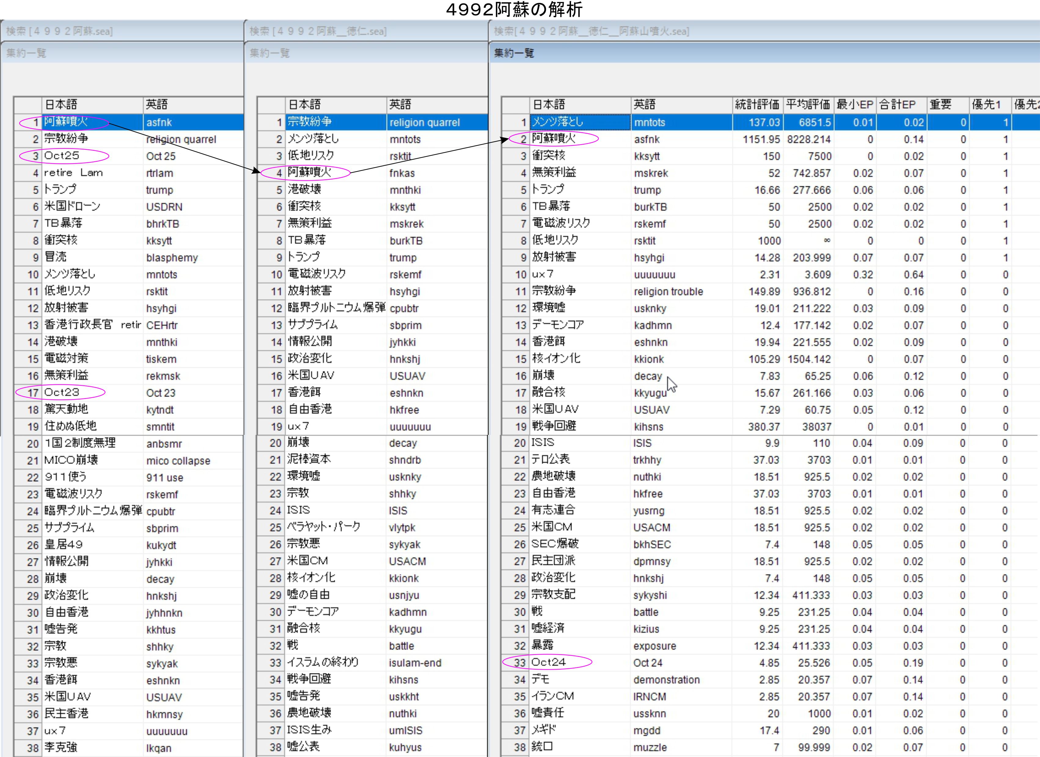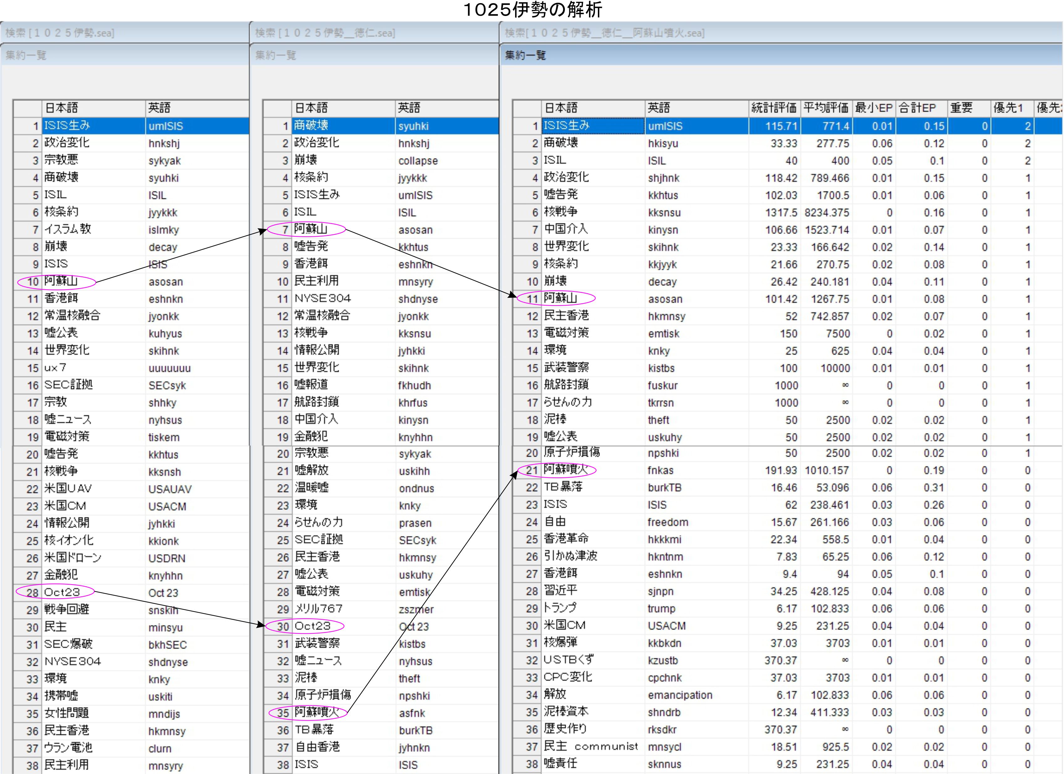 書きかけの記事には敦賀と柏崎の解析結果が載せておあります。伊勢と阿蘇山と敦賀には噴火と溶岩の相関があり、敦賀には10月末に一定の集中が見られており柏崎よりも強いでしょう。実際にこの通りにするかはこれからですし、手作業で日時を確認する作業が大変なので、目先の数日分が処理出来る範囲です。