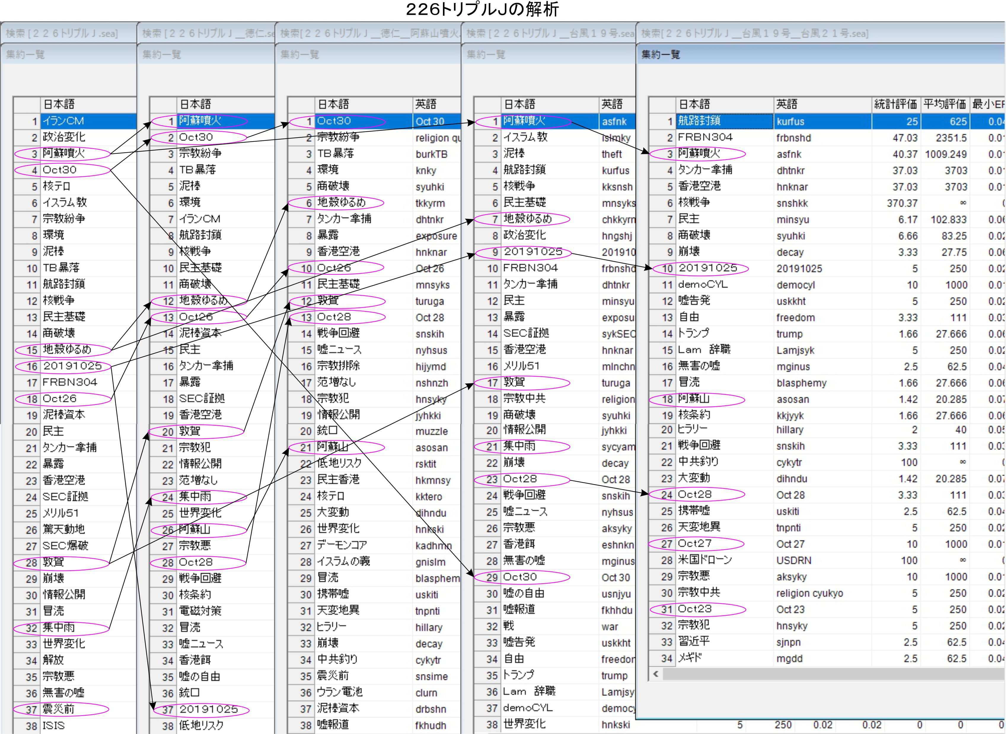 見た目では、10月25日だった集中豪雨による三重会合点の調整と、続きの阿蘇山の噴火と自然災害の日時が混ざっている感じです。226側で10月25日が強調気味で、10月28日と30日に集中を感じられる状況です。31側では10月30日の強調と言えるでしょう。それぞれ阿蘇の噴火と自然災害との区別もつかないでしょう。敦賀と柏崎の区別も、敦賀の方が強めというレベルでしょう。