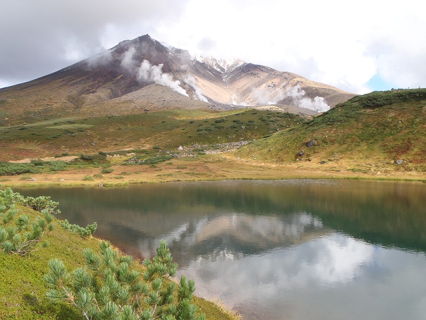 写真は頂上だけ雲に隠れた旭岳です。6合目から上には雪も積もっていて、雪の上を歩くことになり、寒かったです。データーをPCに取り込んだ後で、手前の夫婦池に旭岳が映り込んでいることに気がつきました。デジカメさんの良い仕事にありがとうでした。