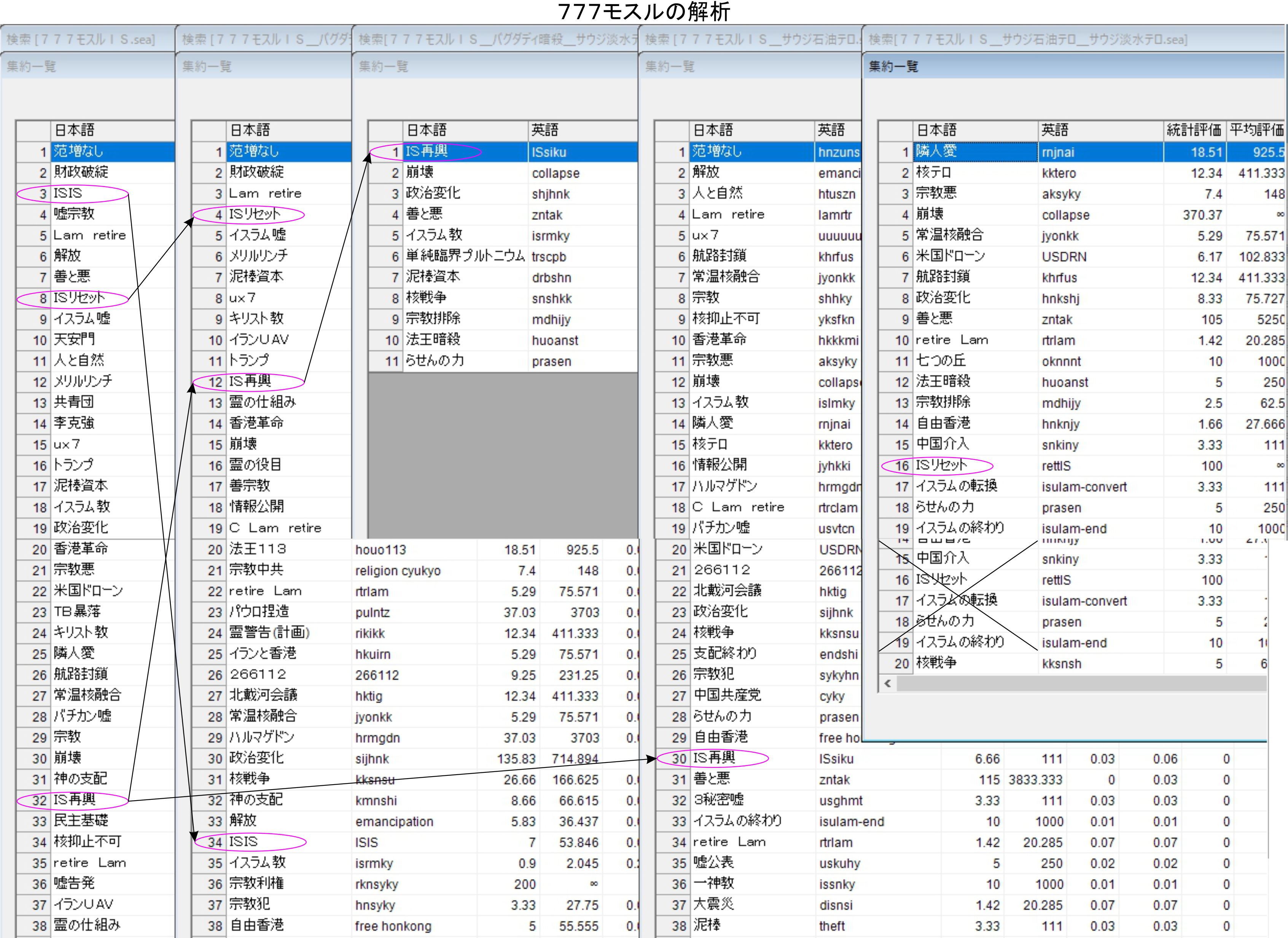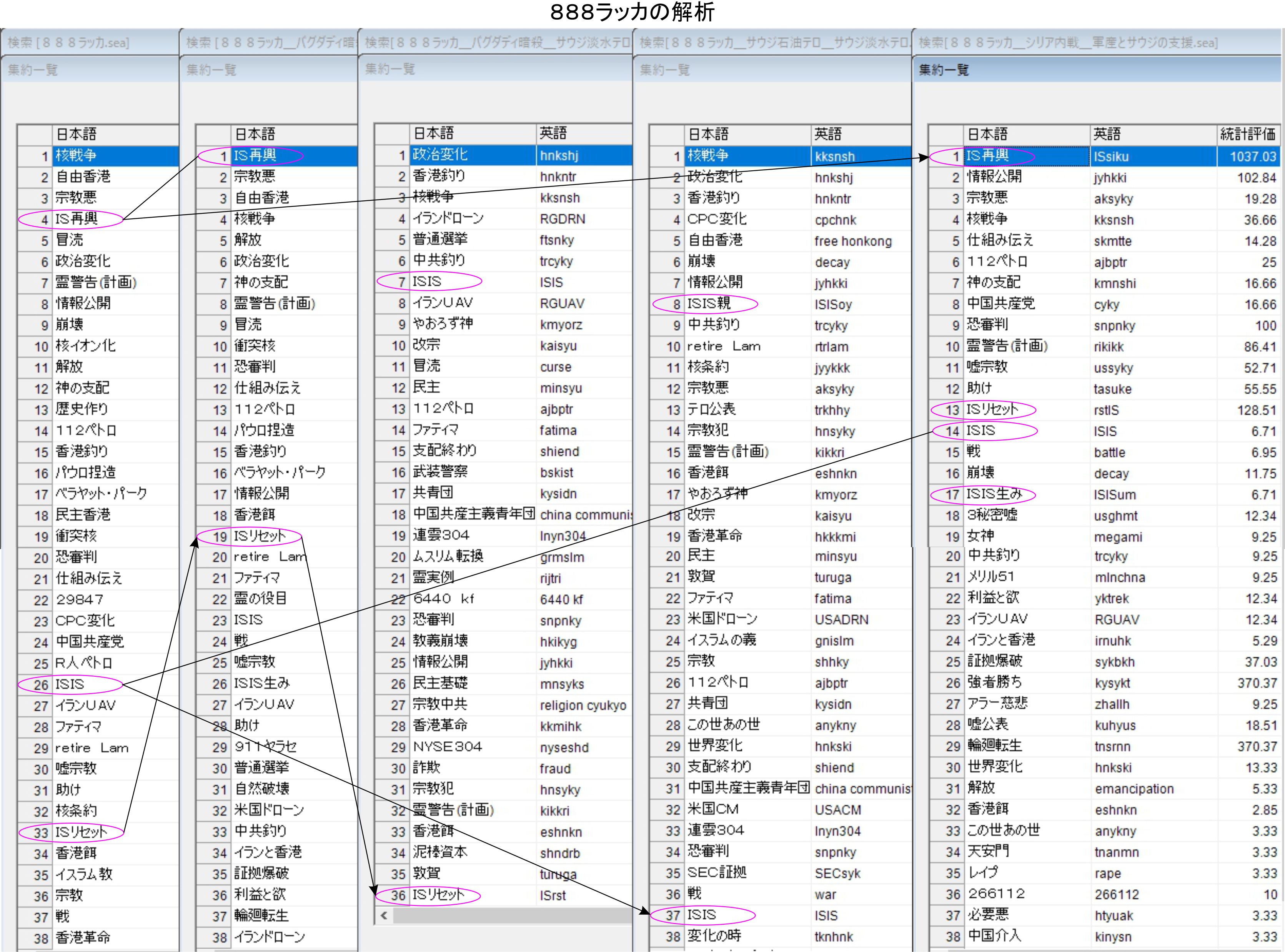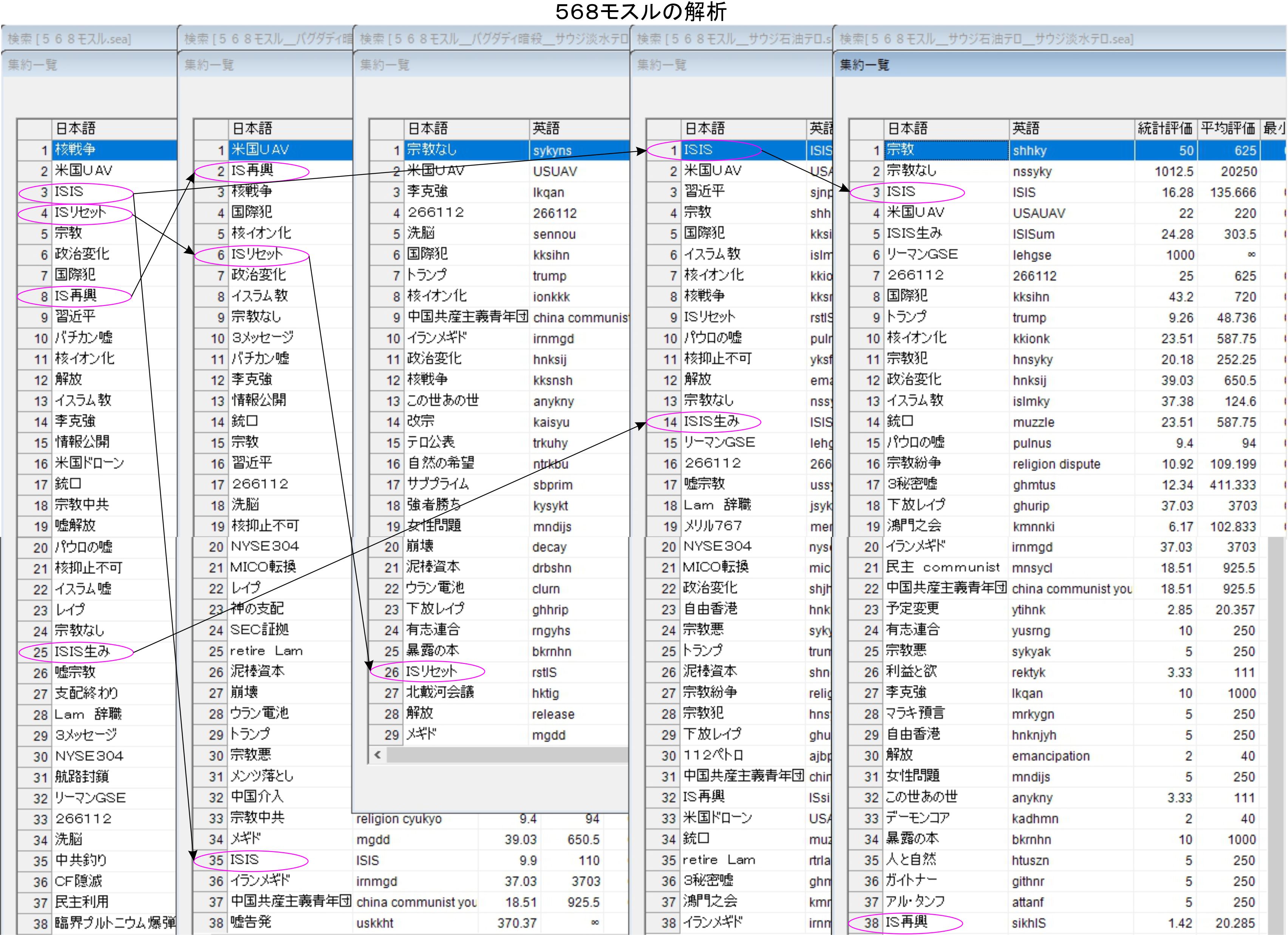 777モスルで見る暗号通信文の側では、バグダディの暗殺、ジュバイルの淡水化施設へのテロで順位が1番までIS再興が上昇します。元データーの32位からの上昇であり、大きなリスクであると言いたいのでしょう。568との比較で見ても計画されている物であり、この動きを外すことが重要でしょう。