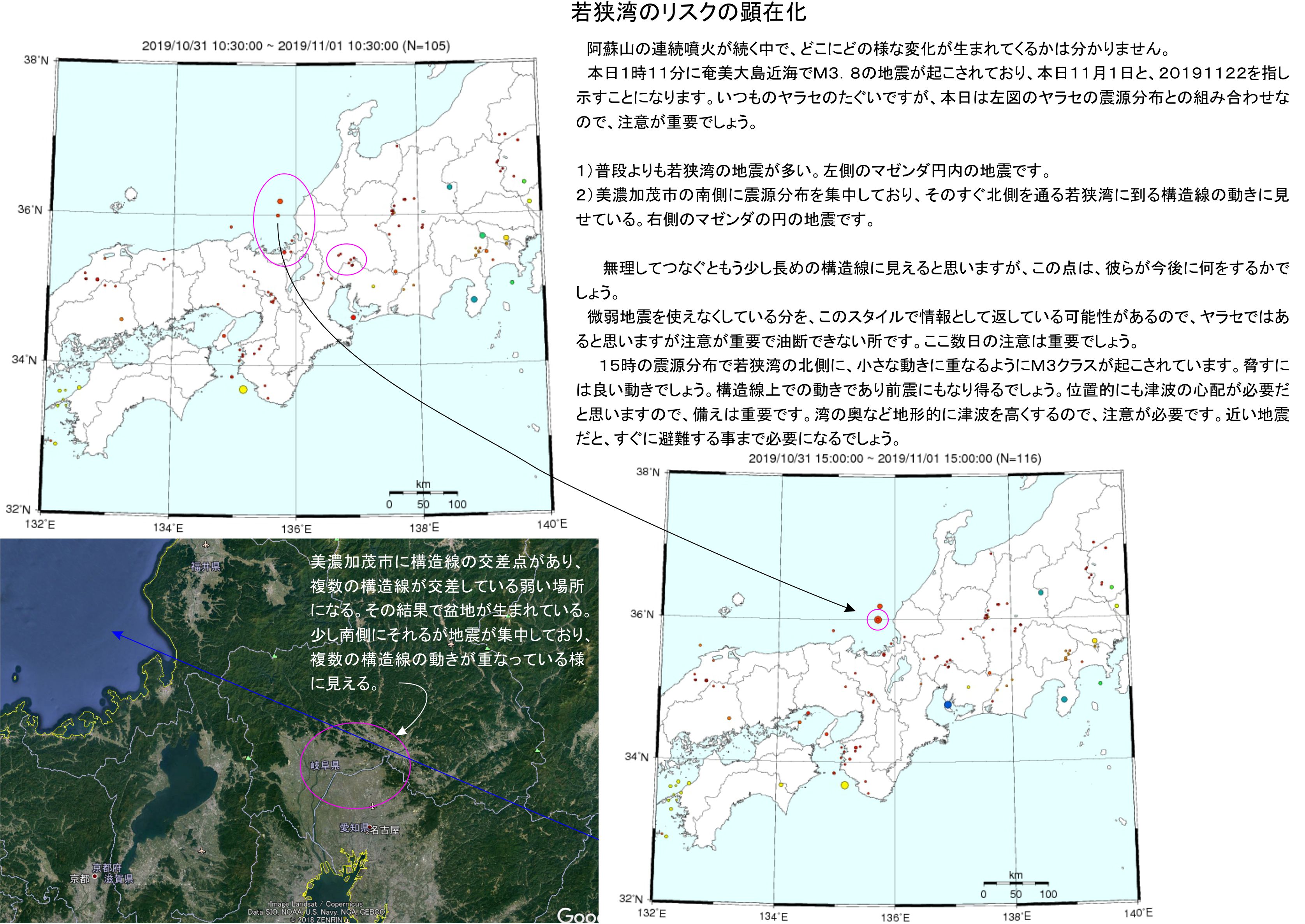 今回の物は周期的に考えると、美濃加茂で繰り返す必要性は低いと思えるのですが、油断は出来ないでしょう。若狭湾周辺を動かすための意図的、ヤラセのサインなら良いのですが、そこまでの判断が可能な大きめの構造線型の地震の前兆を見たことがない以上、リスクサイドとしては美濃加茂周辺から若狭湾までの広い領域で、大きめに揺れが起きても不思議はないとなります。