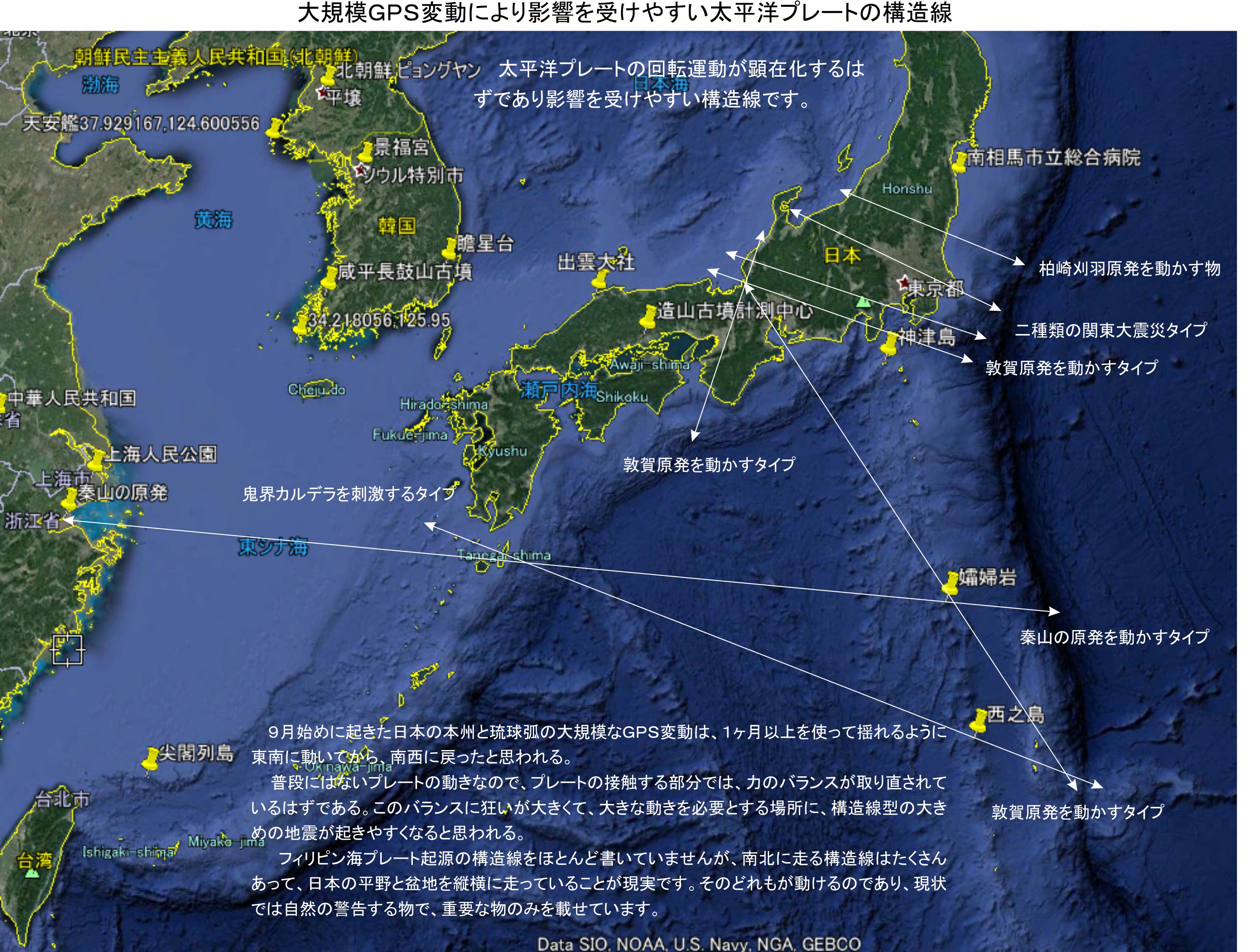 日中の物ですが、大きくは太平洋プレートの回転運動により動かされる構造線が、大規模な地震になる原因です。その動きには様々に理由が考えられるのですが、今回自然は大規模に日本列島にGPS変動異常を起こしてみせることで、その仕組みの一つを教えていることになると思います。これから結果を出す前に、もしかしたらぎりぎりですが、科学を教えることで備えを促すのでしょう。