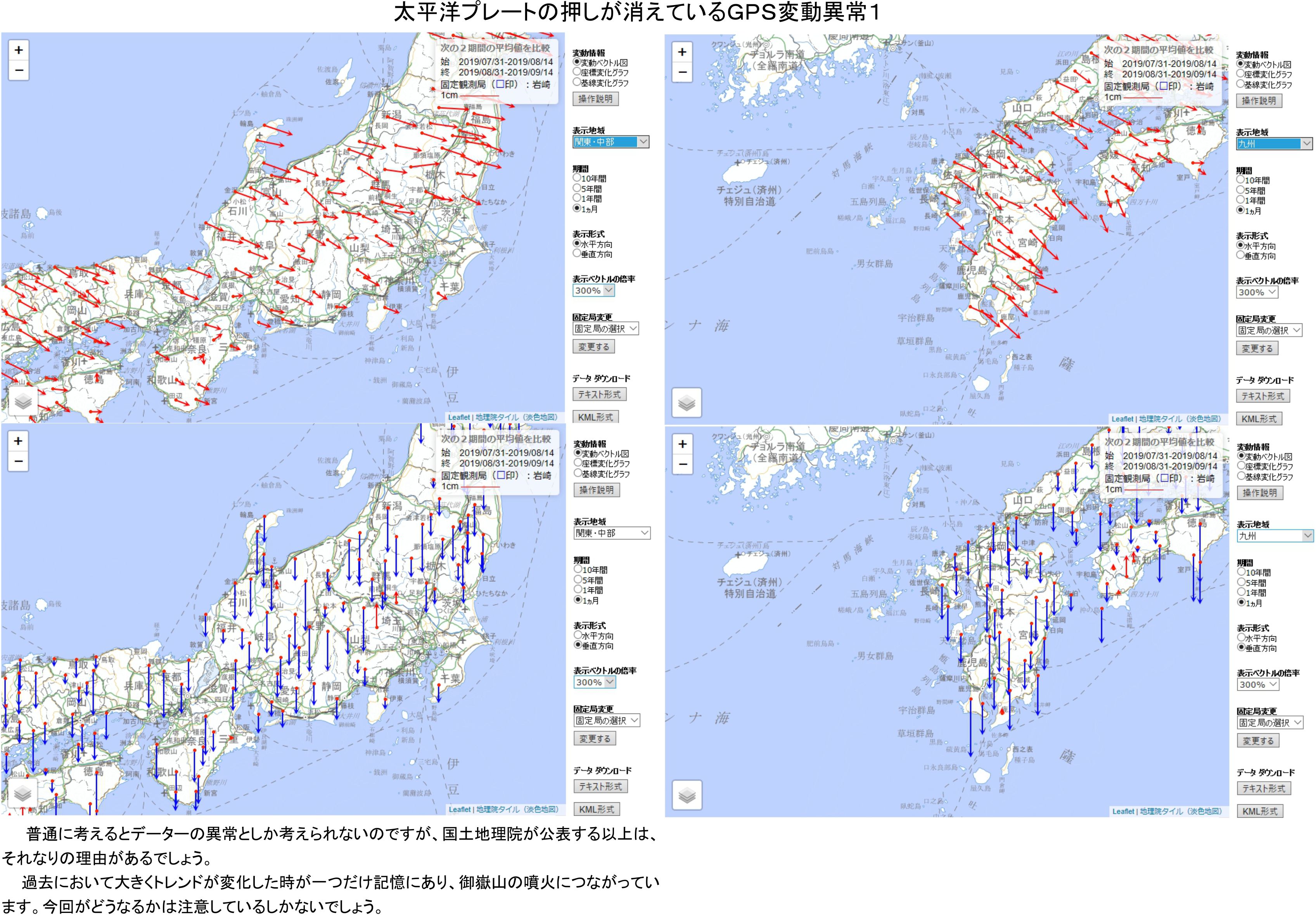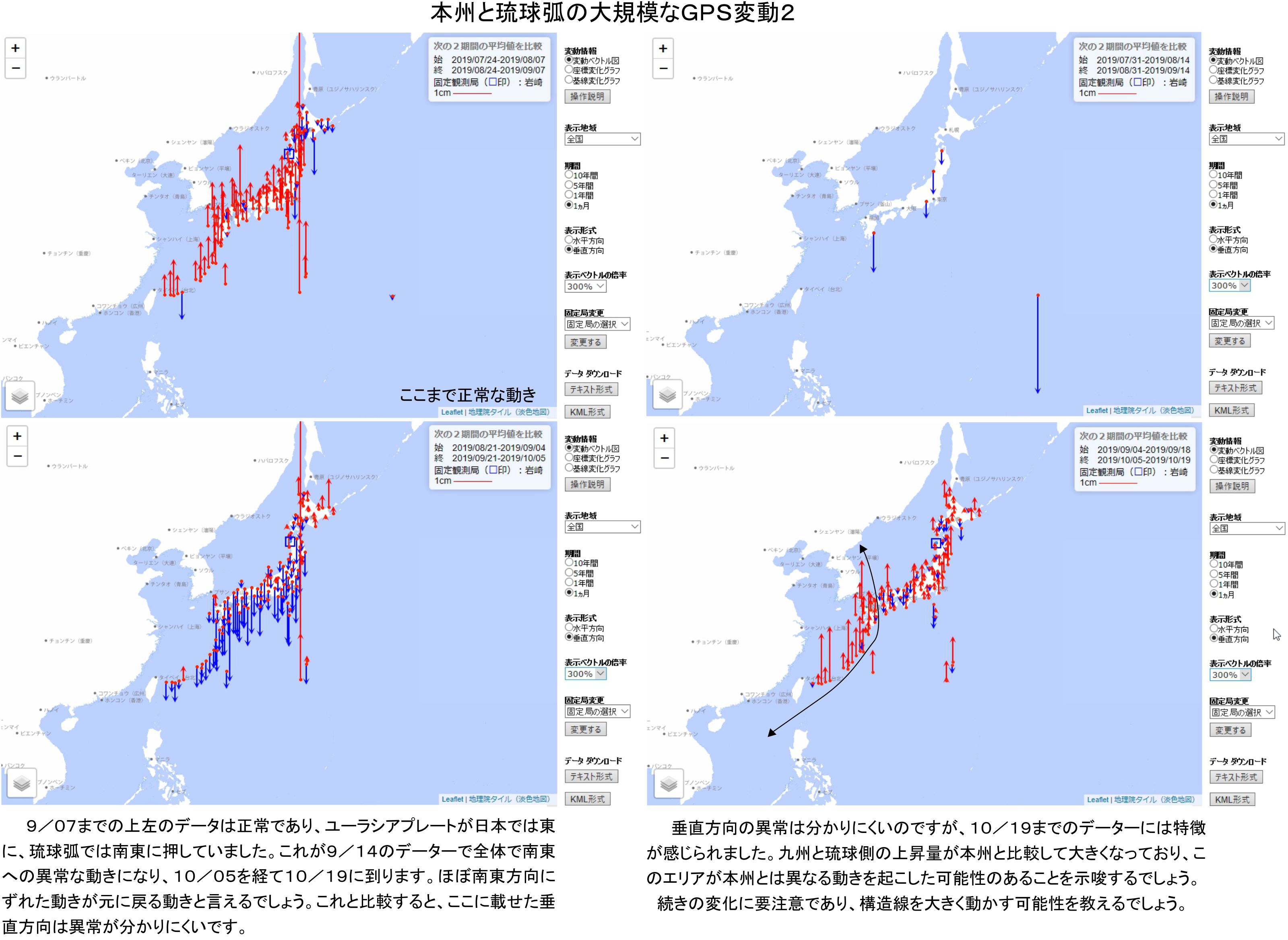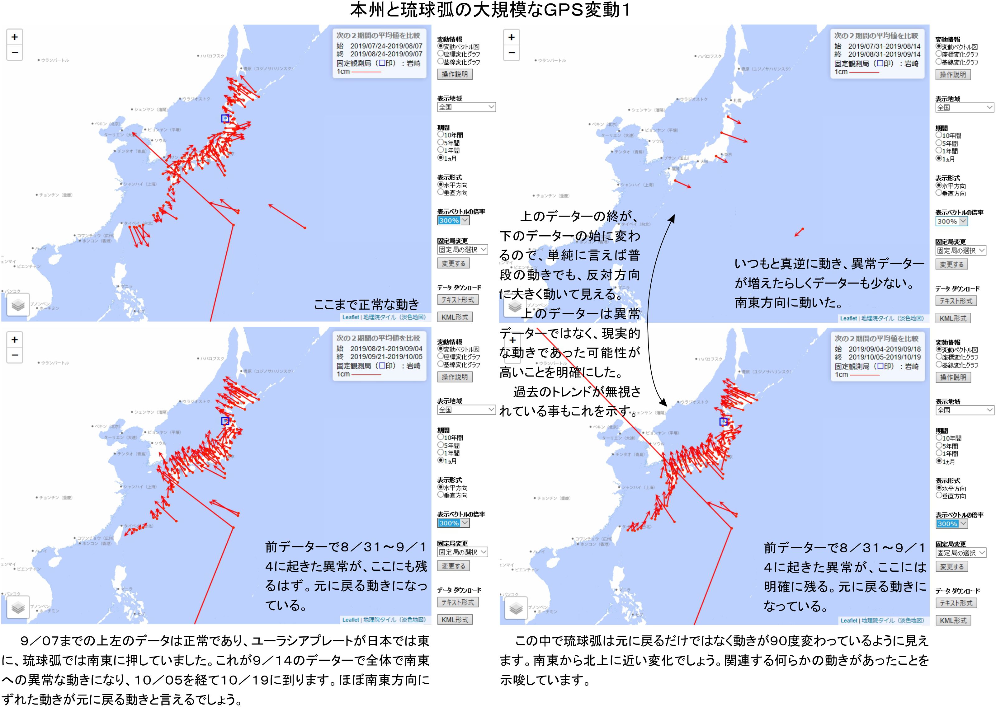 9/07までのイラスト上左のデータは正常であり、ユーラシアプレートが日本では東に、琉球弧では南東に押していました。これが上右の9/14のデーターで全体で南東への異常な動きになり、下左の10/05を経て下右の10/19に到ります。ほぼ南東方向にずれた動きが元に戻る動きと言えるでしょう。