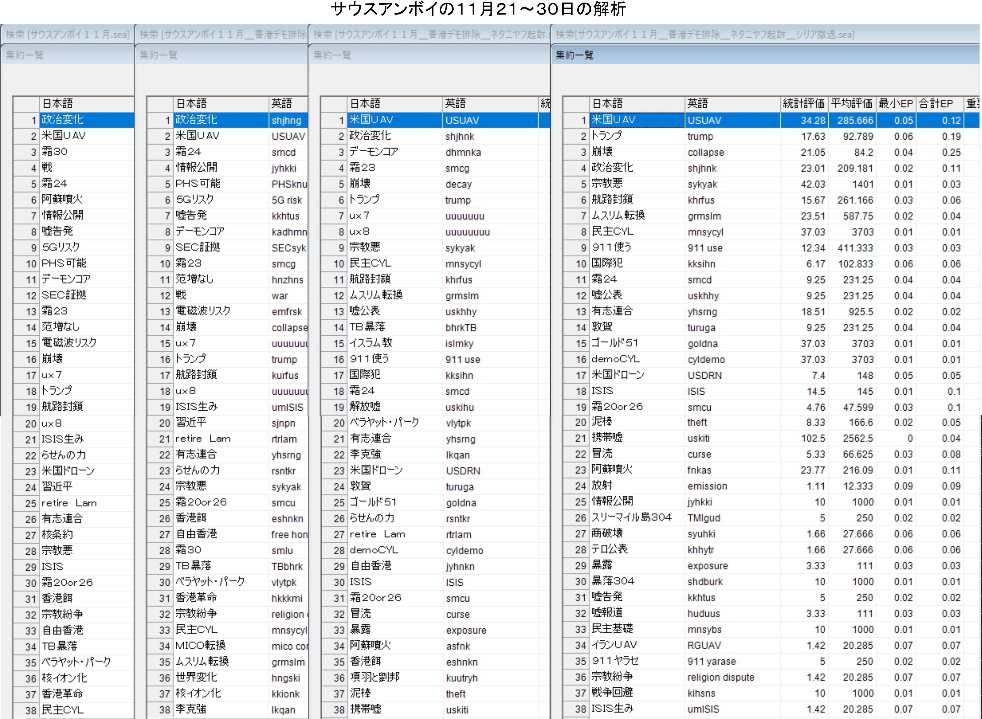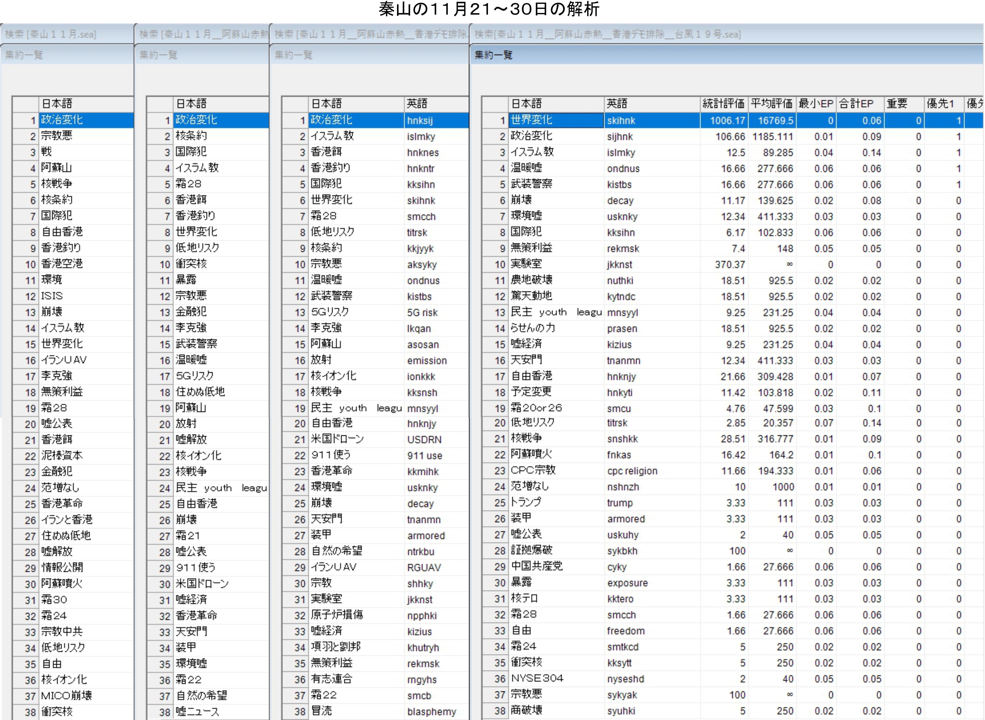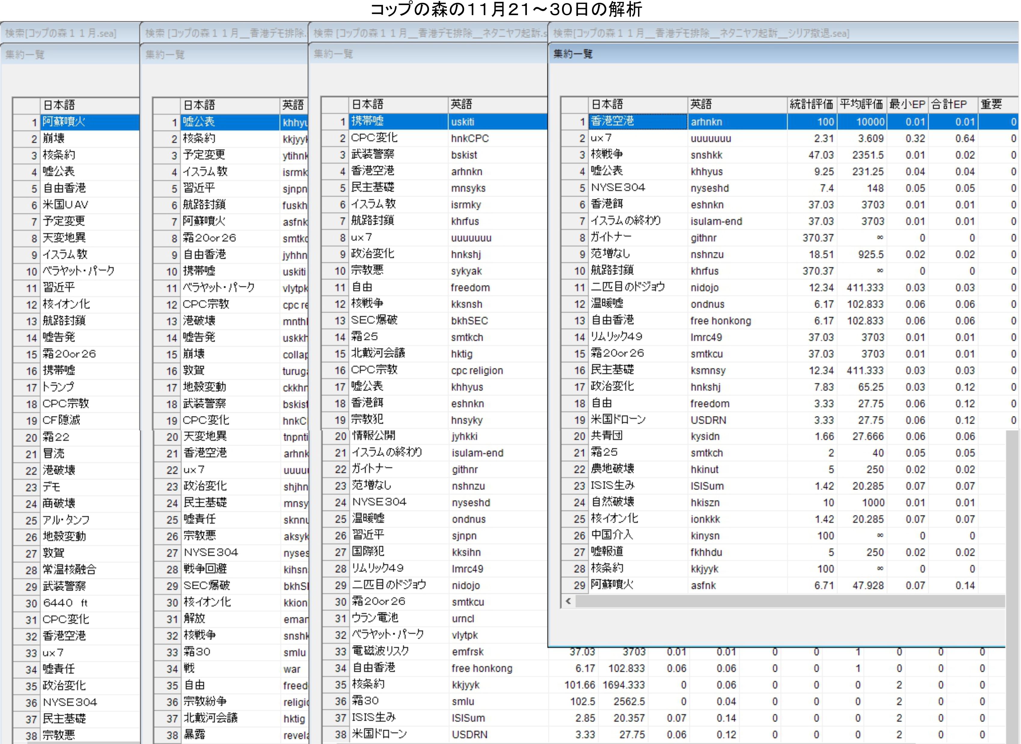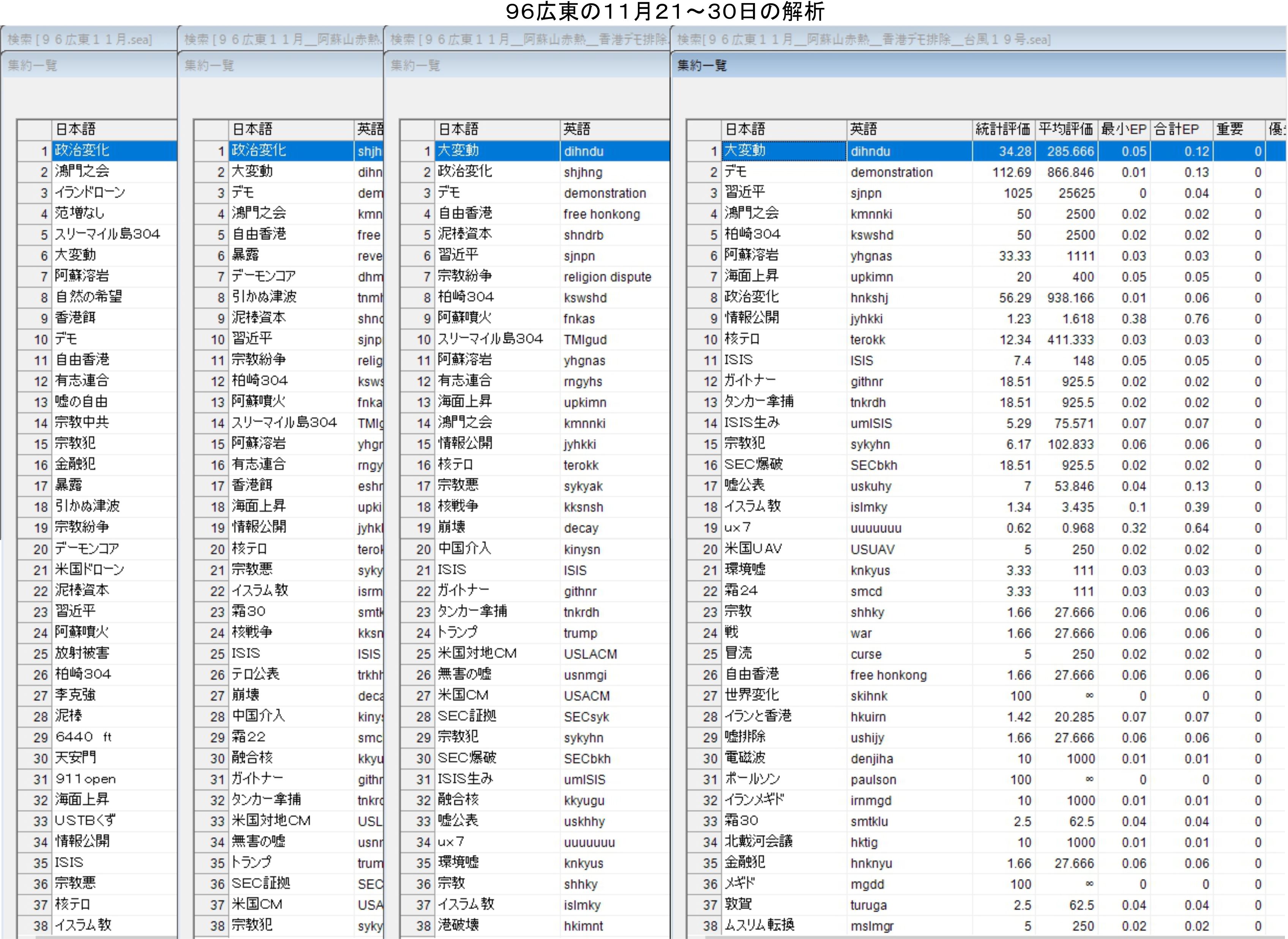 期待の20191119を偽善の側の香港デモ隊排除で使い敵を先行させ、続きの強調日時は20191122です。この前後には何らかの動きが出てくるのではないかと思います。22日はまだ場所が分かりません。構造線の地震における前兆と言える準備は進んでいます。上海エリアと広東を動かす物と、敦賀と北京を動かす物は複数のM5とM7.1まで使って実演したところです。善の側の警告を無視したデモ隊の排除ですので、その警告を現実化する流れです。偽善の側には自然の動きを止める能力が乏しく、人間側での政治の動きの追求だったのでしょう。