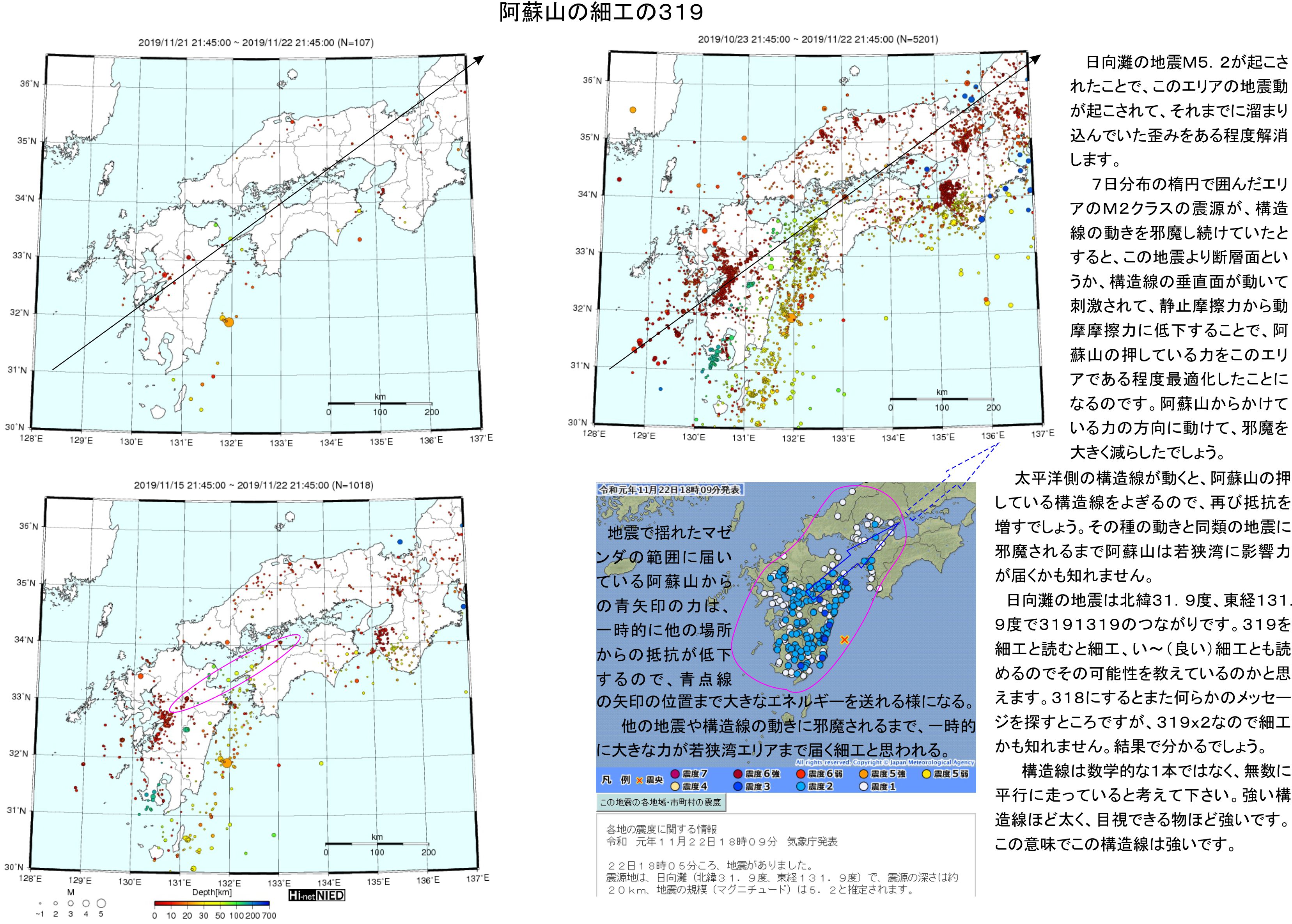 23日の1時2分に、日向灘の同じ場所で3191319の地震がM4.4で起こされており、インド洋から阿蘇山を経て若狭湾への構造線の動きを助ける動きを繰り返しています。組み込みは前記事に載せたとおりであり、20191122を過ぎてなお、49のチェックメイトのために続きを起こしている様子です。
