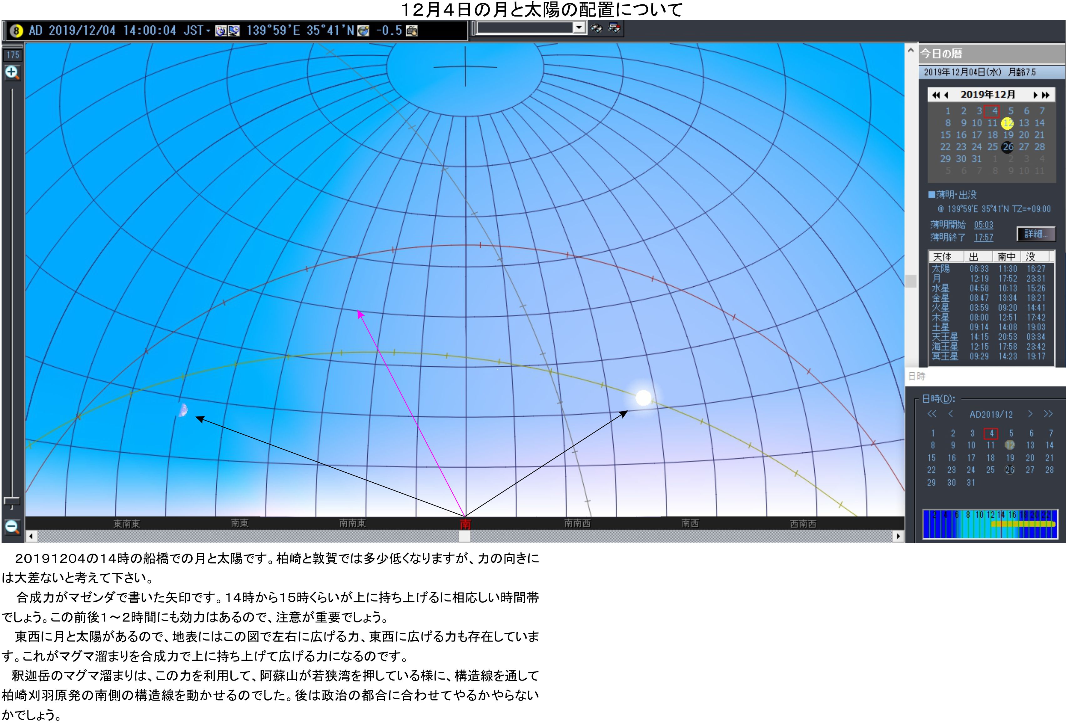 中越沖地震はマグマ溜まり型でしたので、同様に考えると上弦の月があって太陽と合わせて東西45度に配置です。14~15時がこの配置であり、12時間戻しても似ているでしょう。動く場合は津波に可能性があるので昼間の地震にすると思いたいです。