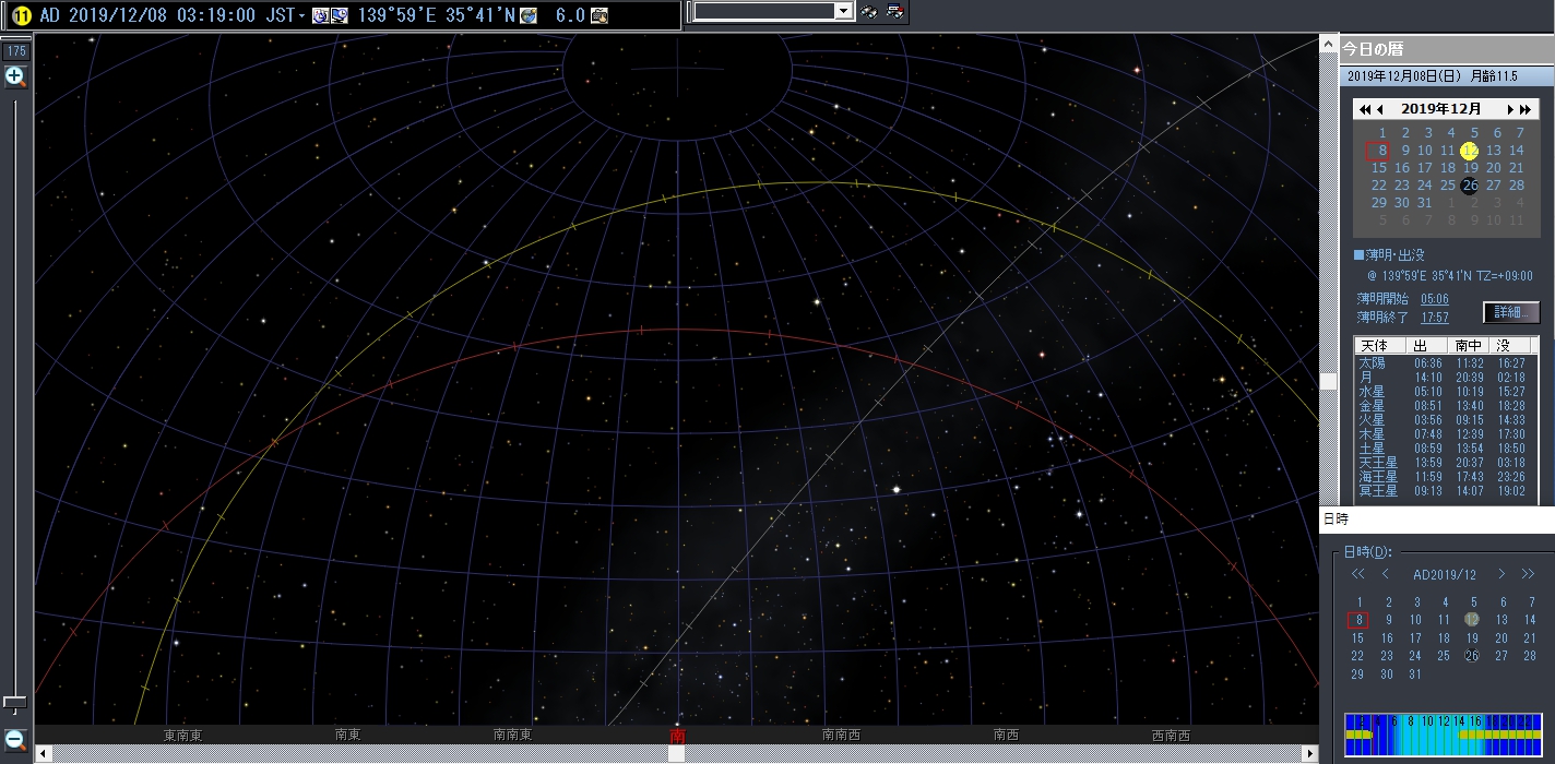 12月8日の3時19分の夜空を載せておきます。日の出と月の入りなど参考に出来るでしょう。配置はどちらかと言えばマグマ溜まり向きです。日の出前の45度ですが月は沈んで1時間なので、構造線型の部分も持つ地震になると思います。
