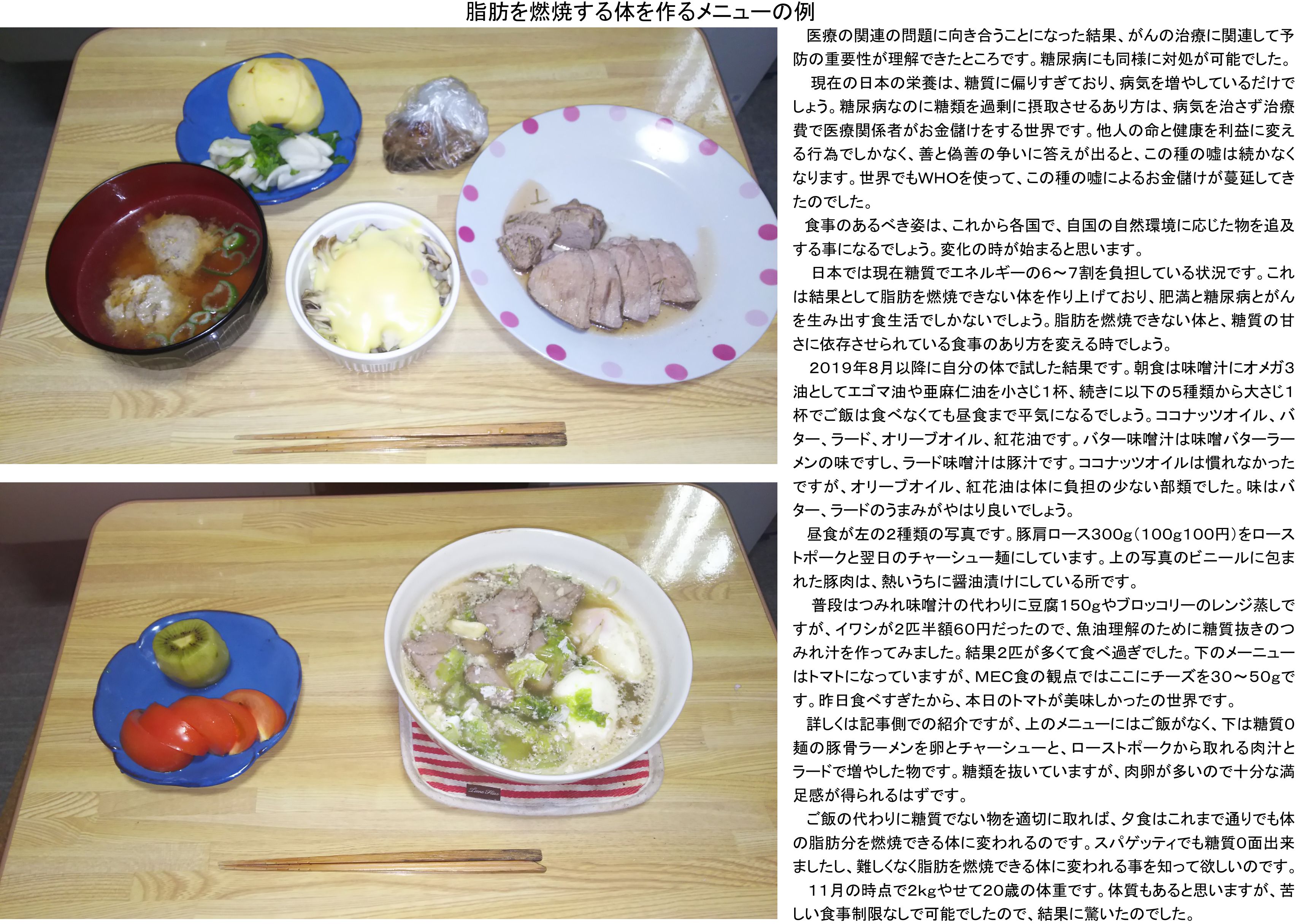 脂肪を燃焼できる体は重要なので、医療の記事にて詳しく触れる予定です。その為の準備で料理の写真を撮ったのでここにも紹介しておきます。脂肪の問題に真剣に取り組んでいる部分をご理解頂ければありがたいです。本代へのご理解とご協力をお願い致します。