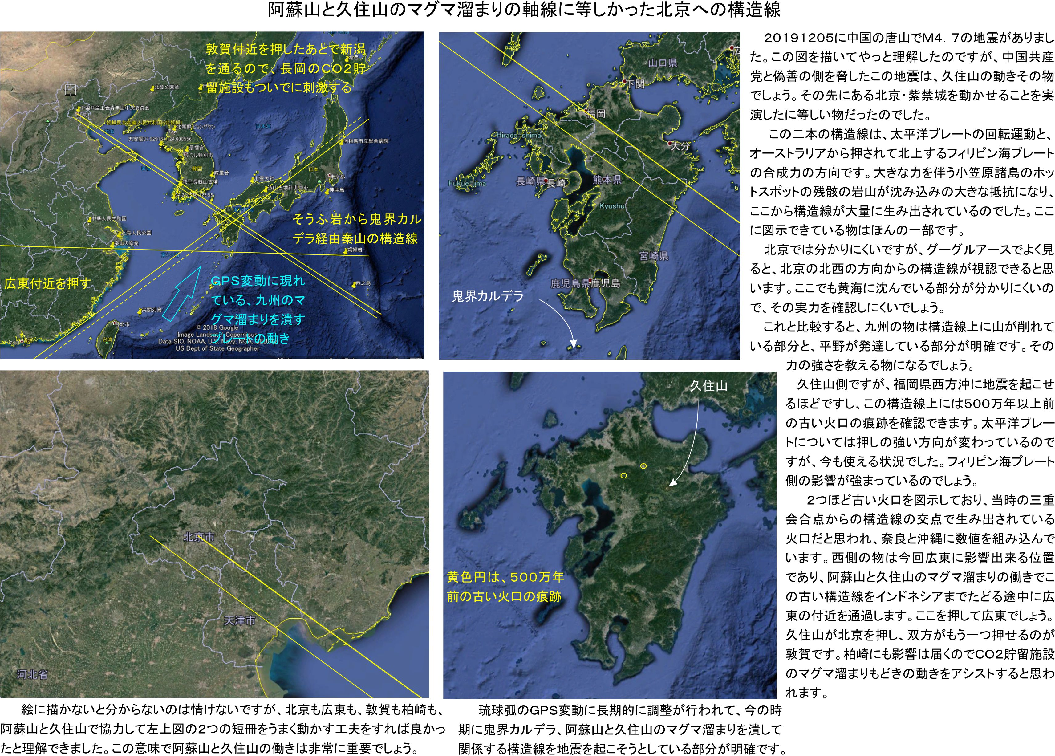 20191205に中国の唐山でM4.7の地震がありました。イラスト1枚目のこの図を描いてやっと理解したのですが、中国共産党と偽善の側を脅したこの地震は、久住山の動きその物でしょう。その先にある北京・紫禁城を動かせることを実演したに等しい物だったのでした。