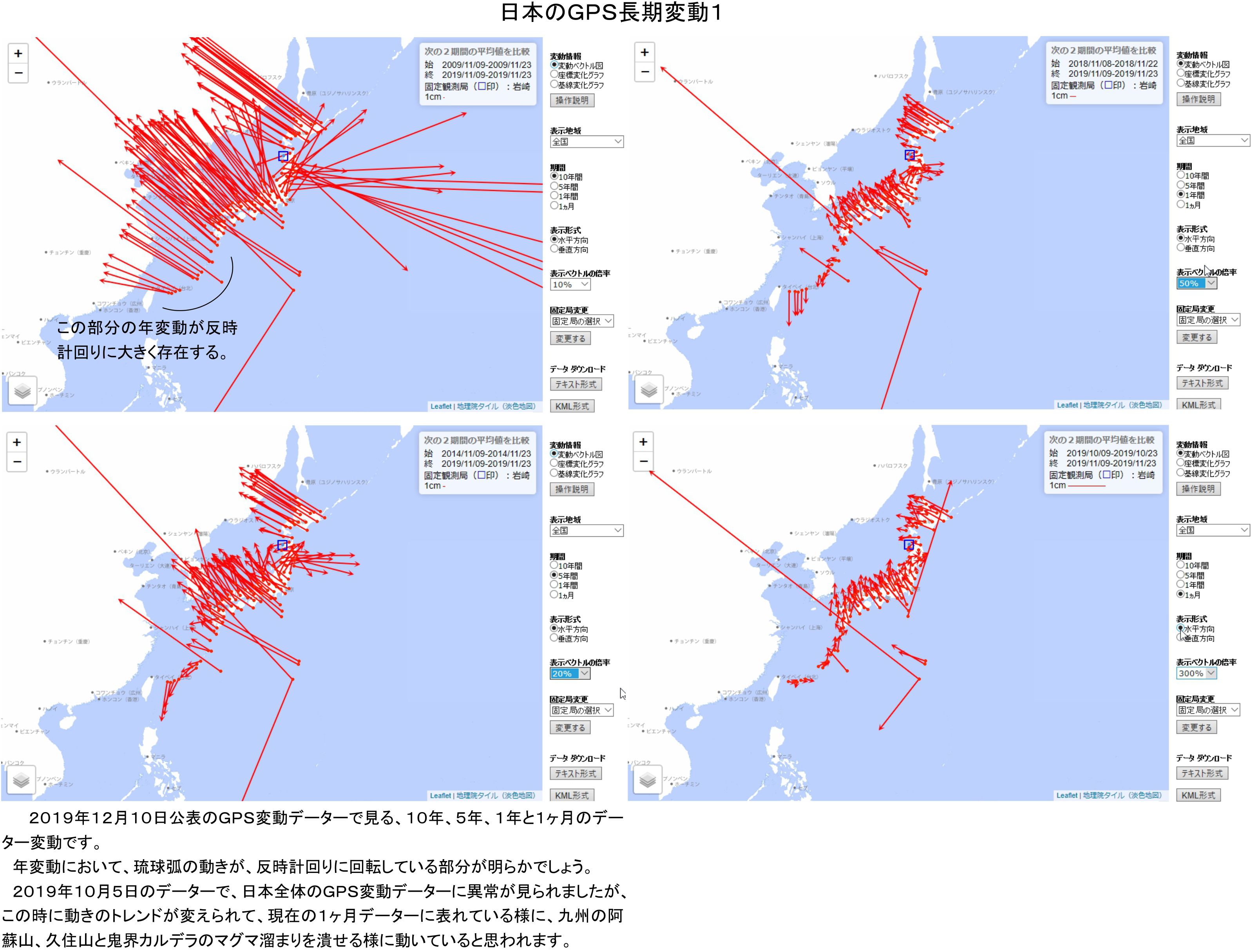 2枚目は2019年12月10日公表のGPS変動データーで見る、10年、5年、1年と1ヶ月のデーター変動です。
