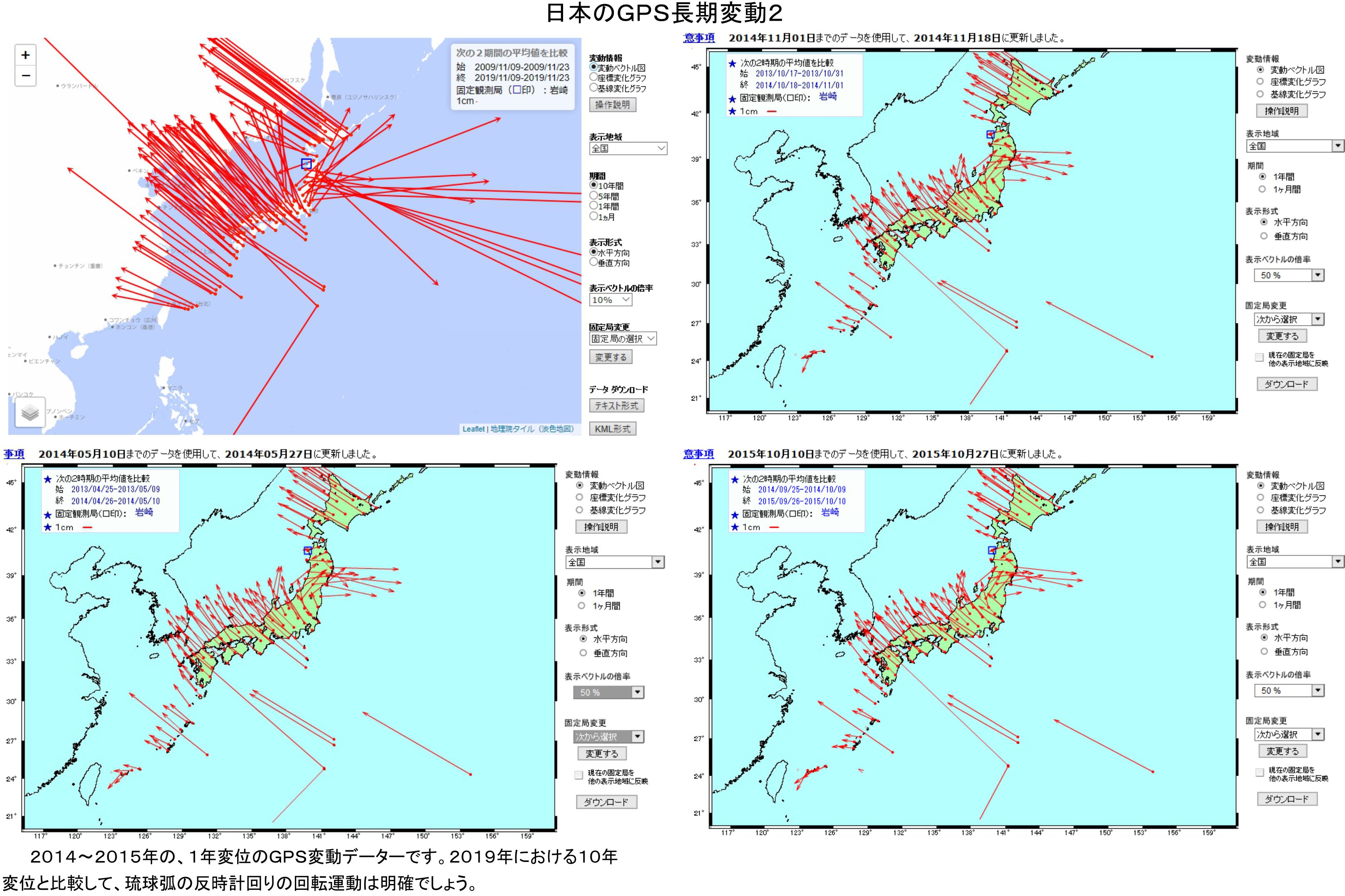 3枚目は、2014~2015年の、1年変位のGPS変動データーです。2019年における10年変位と比較して、琉球弧の反時計回りの回転運動は明確でしょう。