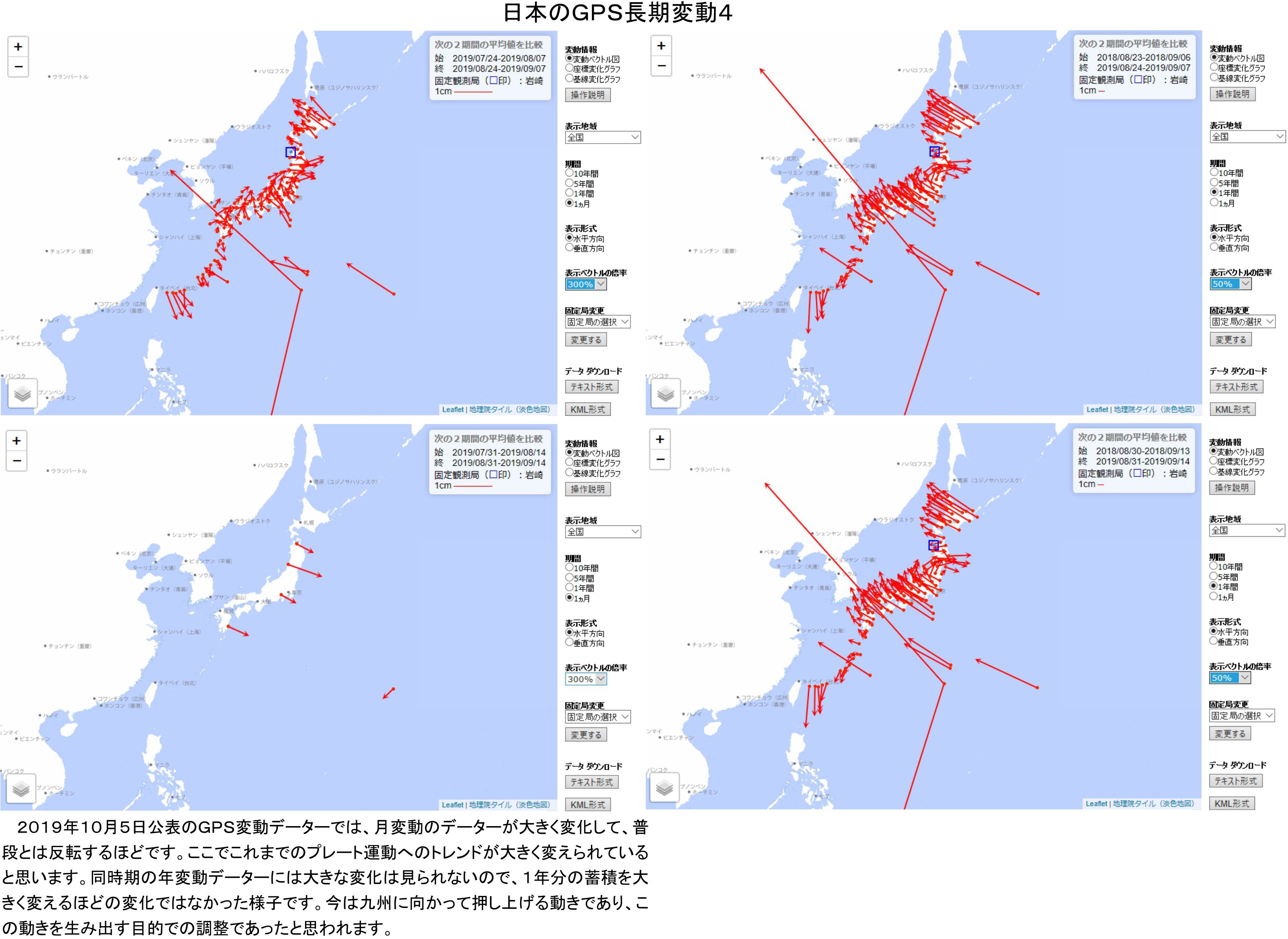 最後は、2019年の10月5日のGPS変動データーの異常ぶりを載せています。普段と異なる動きである部分は明白でしょう。2019年10月5日公表のGPS変動データーでは、月変動のデーターが大きく変化して、普段とは反転するほどです。ここでこれまでのプレート運動へのトレンドが大きく変えられていると思います。同時期の年変動データーには大きな変化は見られないので、1年分の蓄積を大きく変えるほどの変化ではなかった様子です。今は九州に向かって押し上げる動きであり、この動きを生み出す目的での調整であったと思われます。