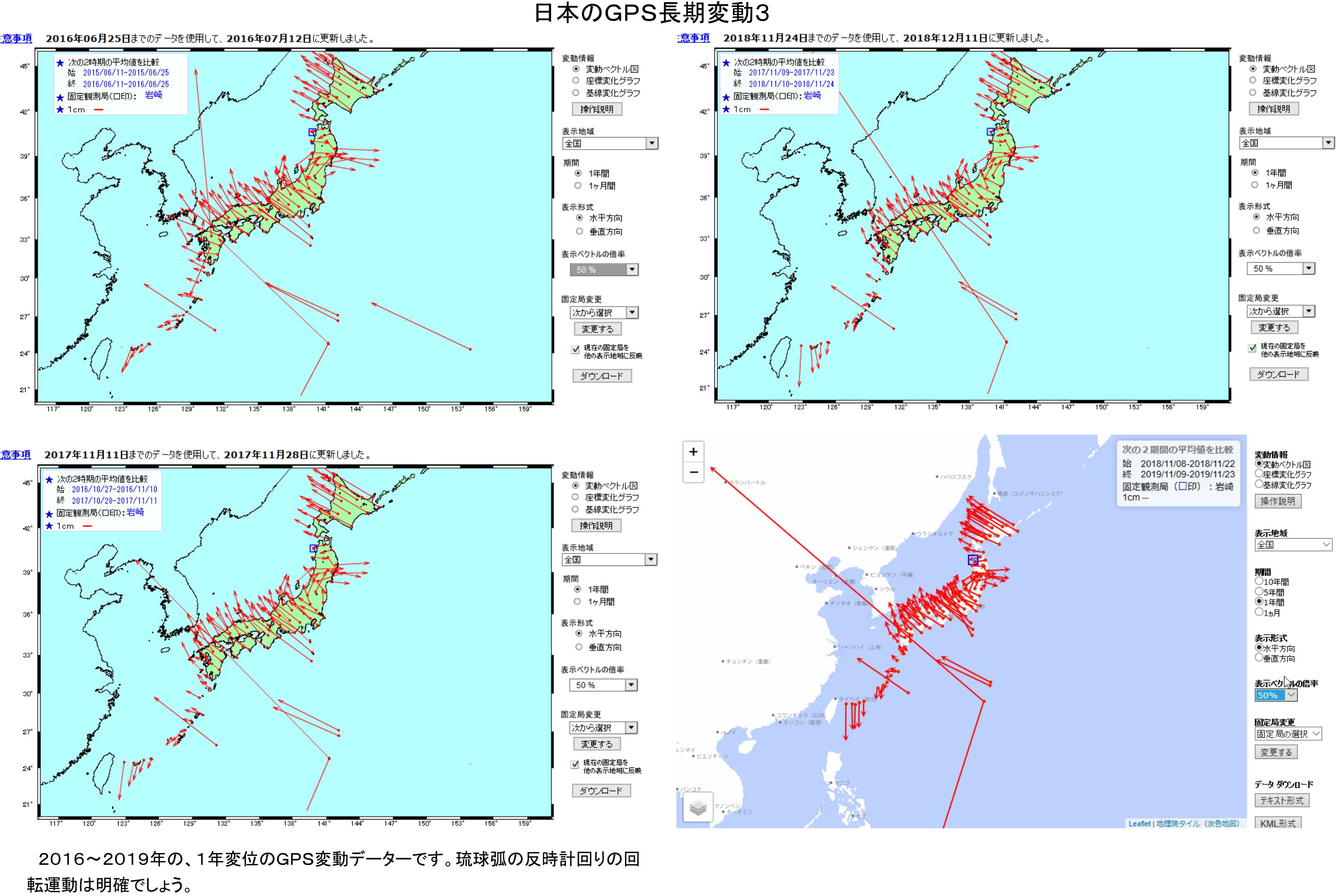 イラストには過去から蓄積してあったデーターを載せています。1年計測のGPS変動データーが2014~2019年まで載せてあります。古い物が201914年にこちらの手持ちデーターの先頭で載せています。