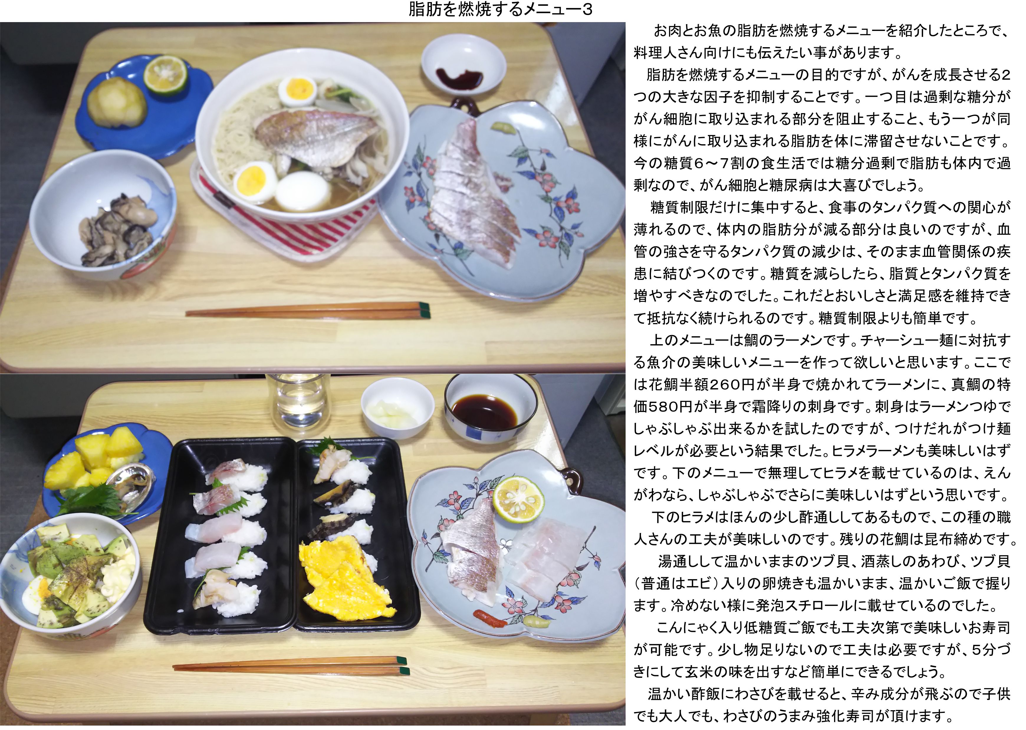 脂肪を燃焼するメニューは、料理店さんには簡単に取り入れられると言う事を知って欲しいのです。ご飯の代わりに豆腐と卵をアレンジした物が出せれば一歩目として十分ですし、コース料理なら糖質抜き麺でも代用可能です。お寿司は低糖質ご飯、ピザやパン屋さんも低糖質パン生地で変われるでしょう。