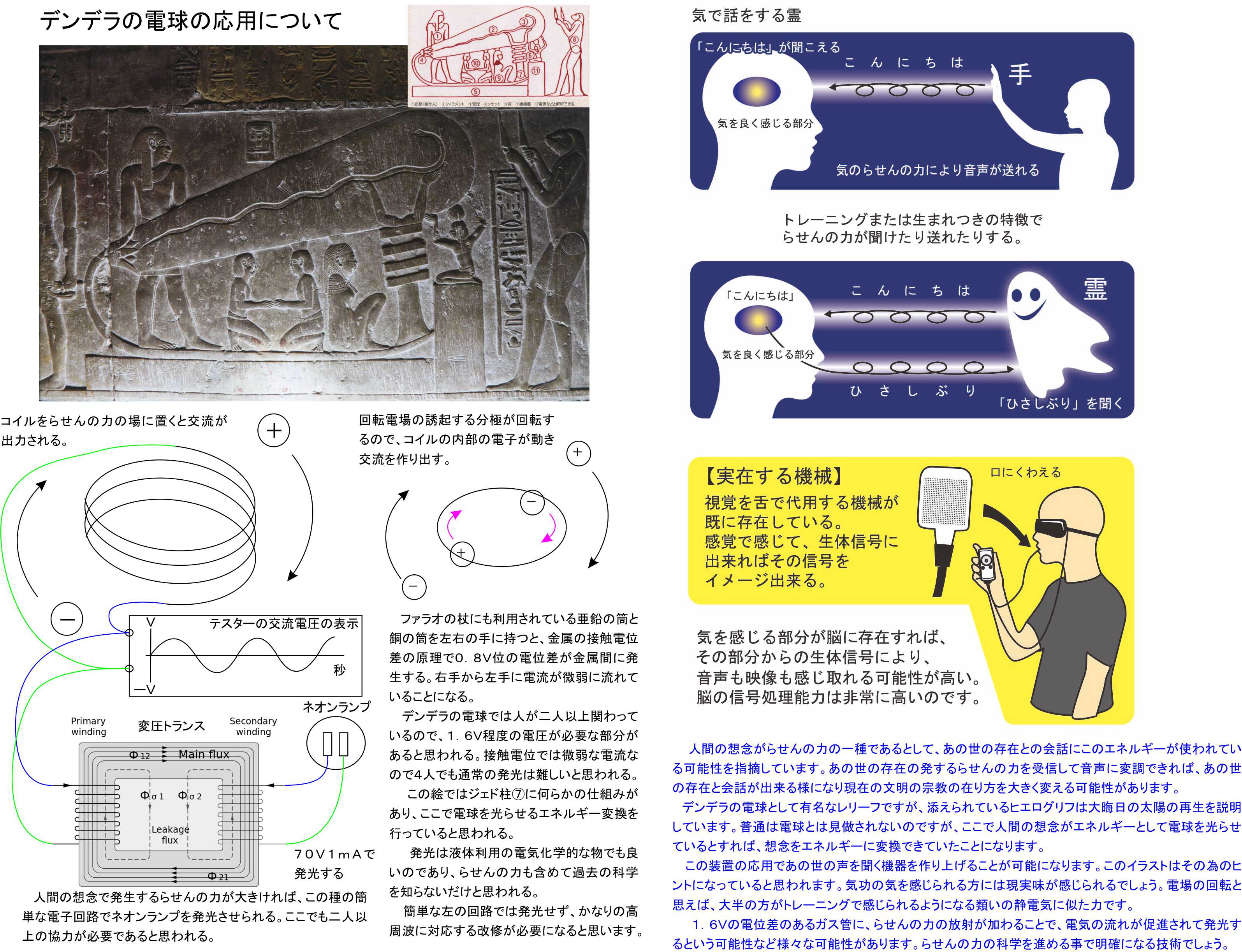 気で言葉をしゃべる様に強弱をつけて能力者に送ると、言葉を発しなくても言葉になるのです。その種の能力がどこかにあるのです。こちらとしてはタンパク結晶のロドプシンにらせん構造を見ていることと、松果体の発生学的な部分で、脳の中にある松果体が元々光を検知するために使われていた器官である部分が、神経接続的にもここかららせんの力を通して神経信号に変換されている可能性が高いと考えています。これらはらせんの力の検出器を作って、順番に確認をして行くだけの話です。やれば出来る科学です。