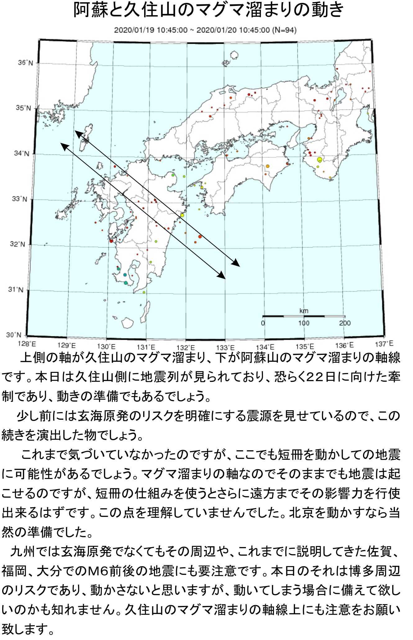 阿蘇山は連続噴火中で、その他特に気になる前兆はありません。目立つ構造線の地震列もありません。22日の前後まで備えと注意をお願い致します。