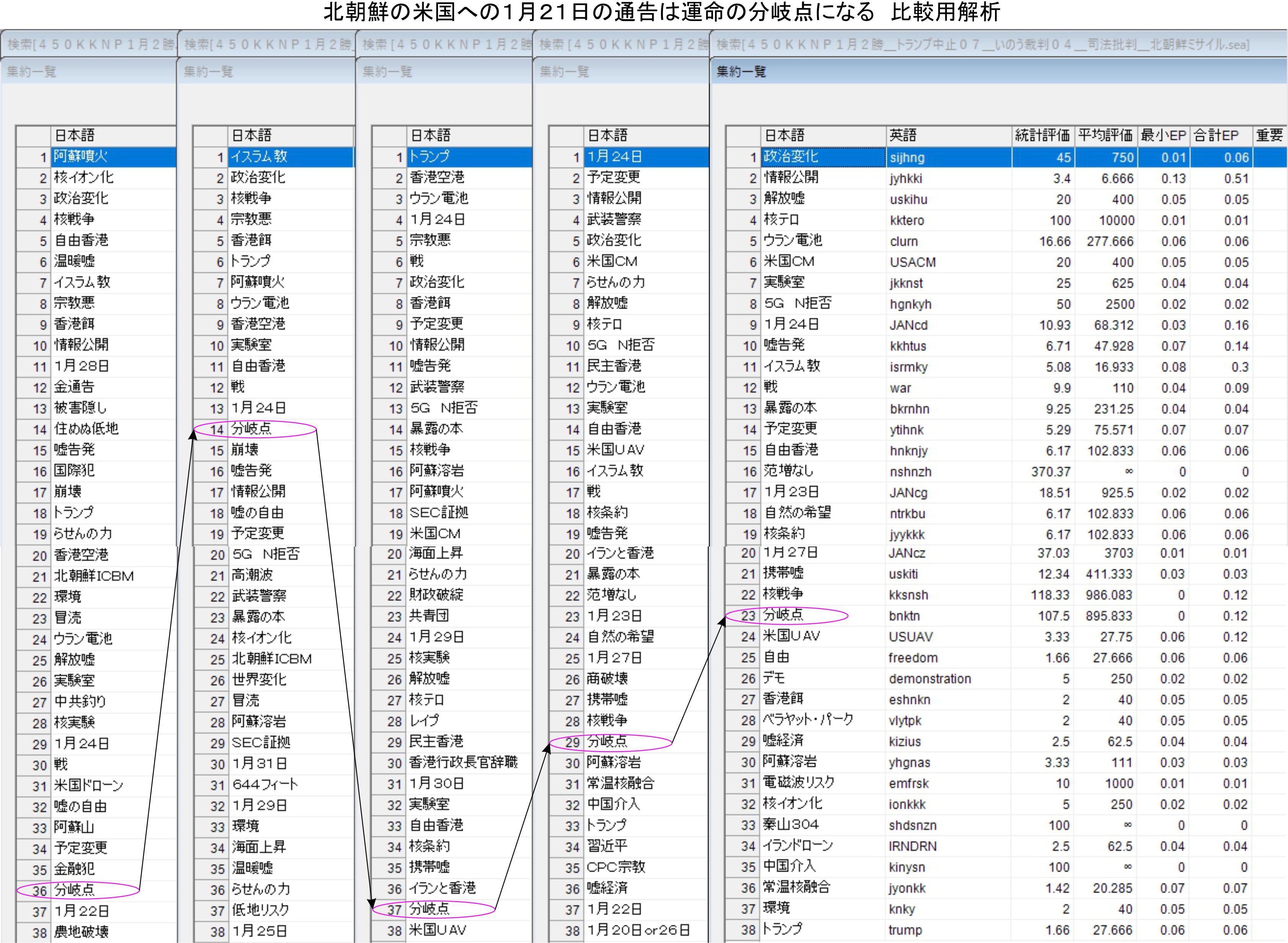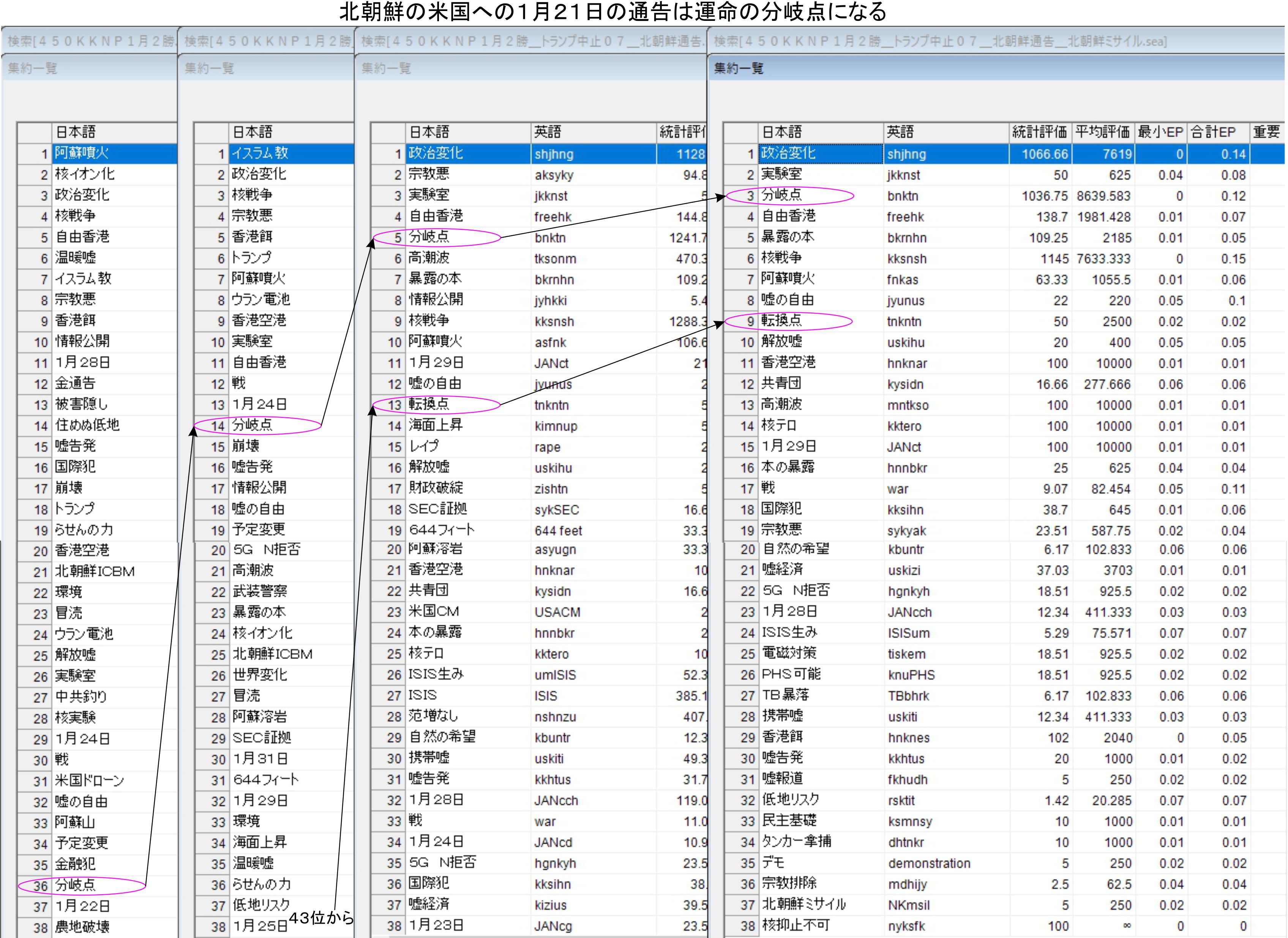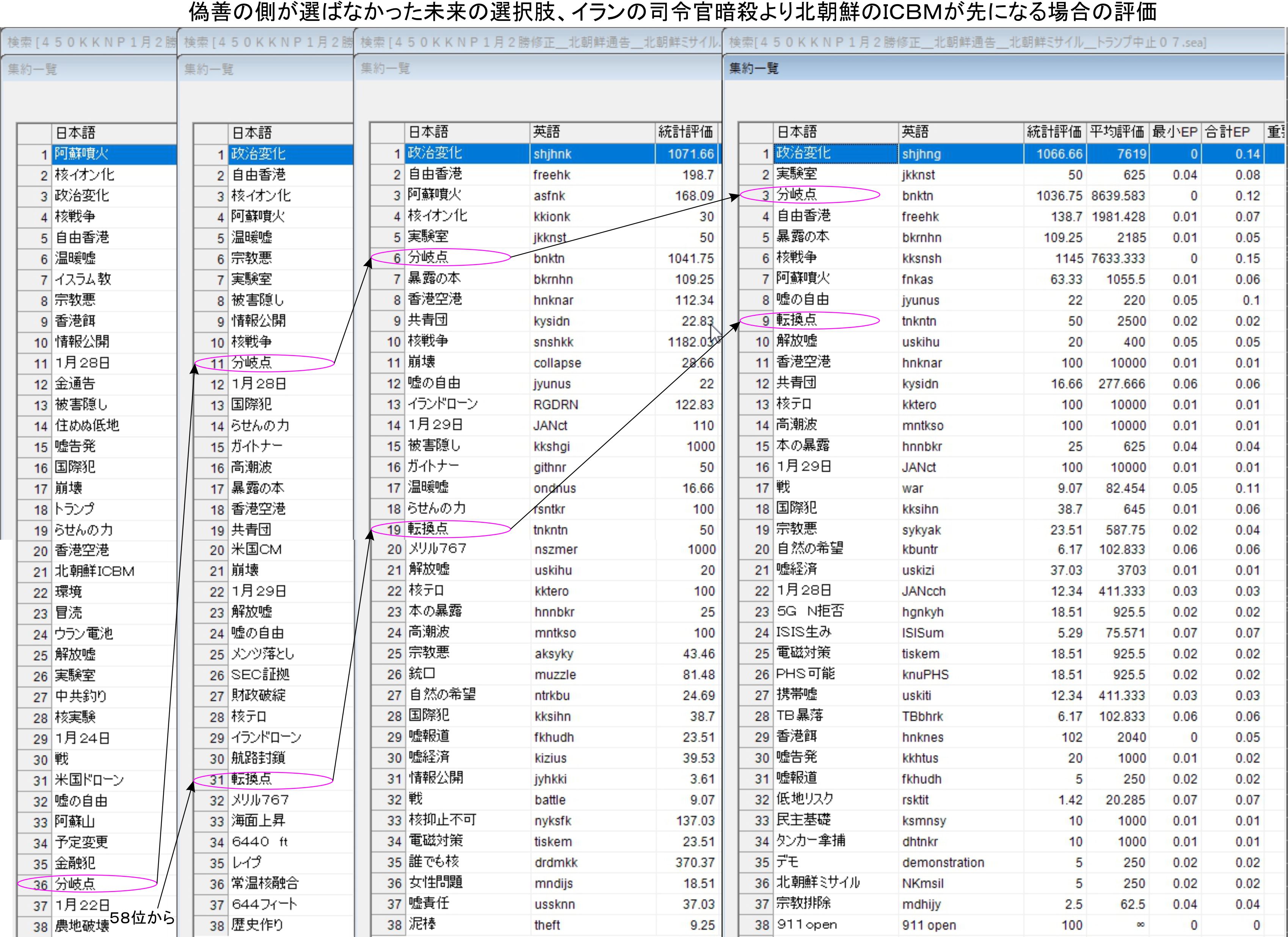 続きで、イランのソレイマニ司令官の暗殺よりも北朝鮮のミサイル発射が先になる場合を評価してみました。転換点の動きを知ることが、未来の作られ方を私たちに教えてくれるはずです。フィルター操作は順番を変えただけで以下となりました。イラストも参照下さい。