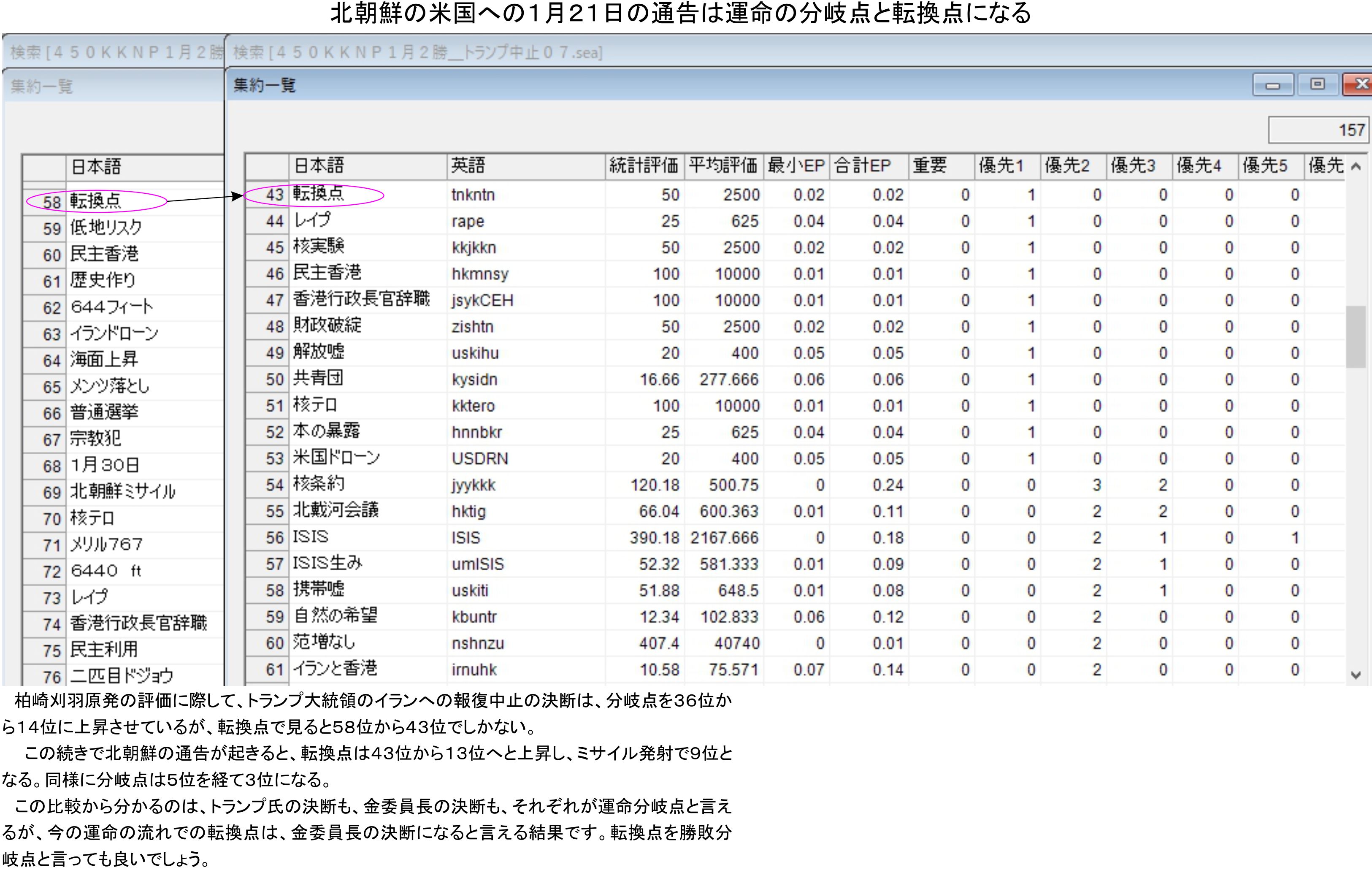 転換点のデーターは、今回の運命の流れにおいては、金委員長の対米通告の決断がこれに該当するのであり、ここまでに引き起こされている状況が異なれば、転換点になるかは分からないでしょう。イランのソレイマニ司令官の暗殺が、金委員長の決断よりも後に起きれば、トランプ氏の決断が転換点になり得るでしょう。