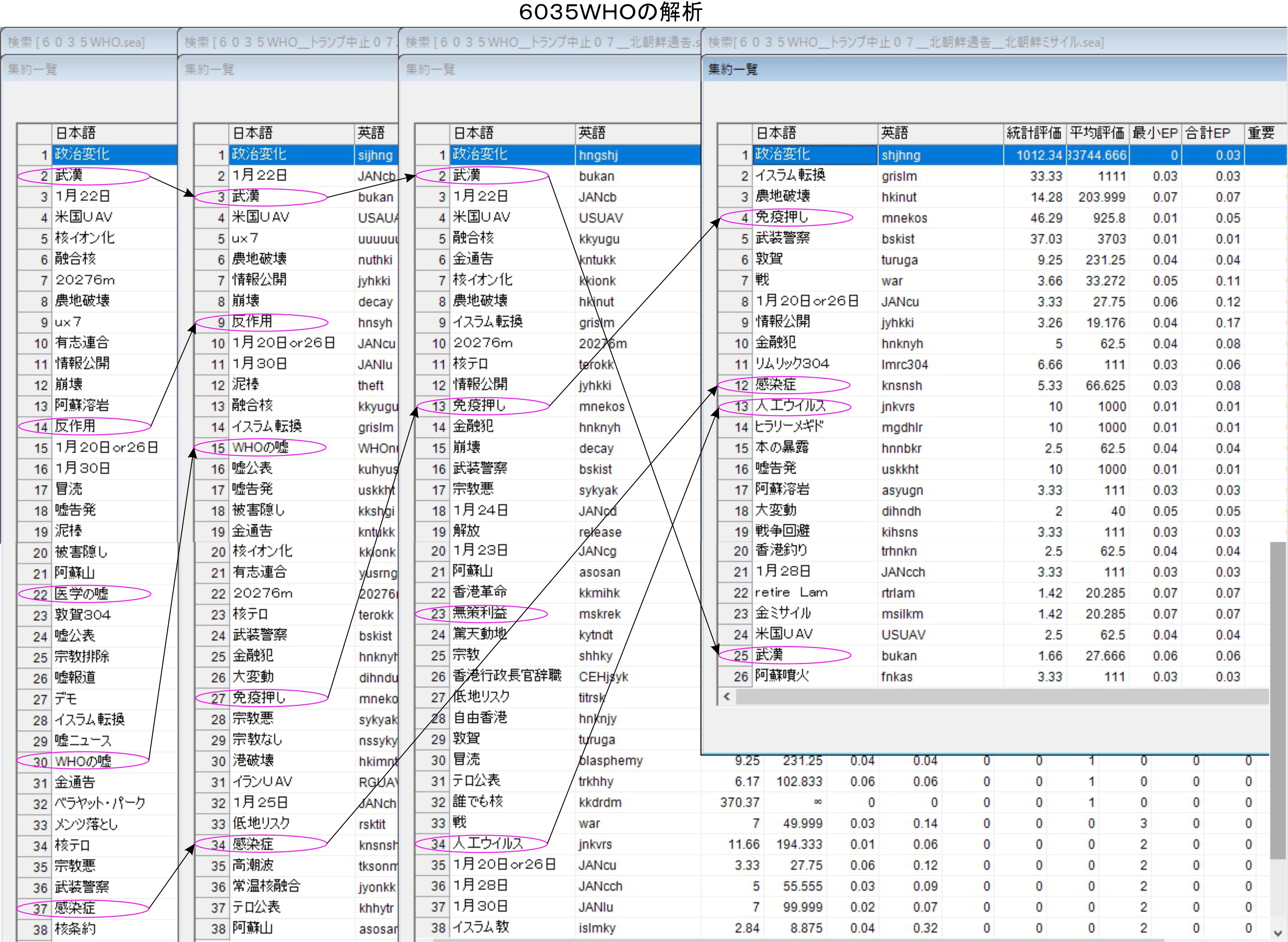 さすがによく工夫されており、6035WHOではコロナウイルス広がりの地である中国の武漢が上位に組み込まれています。6035WHOで見ると、WHOの嘘、免疫押し、感染症、ついでに人工ウイルスまでが出ています。