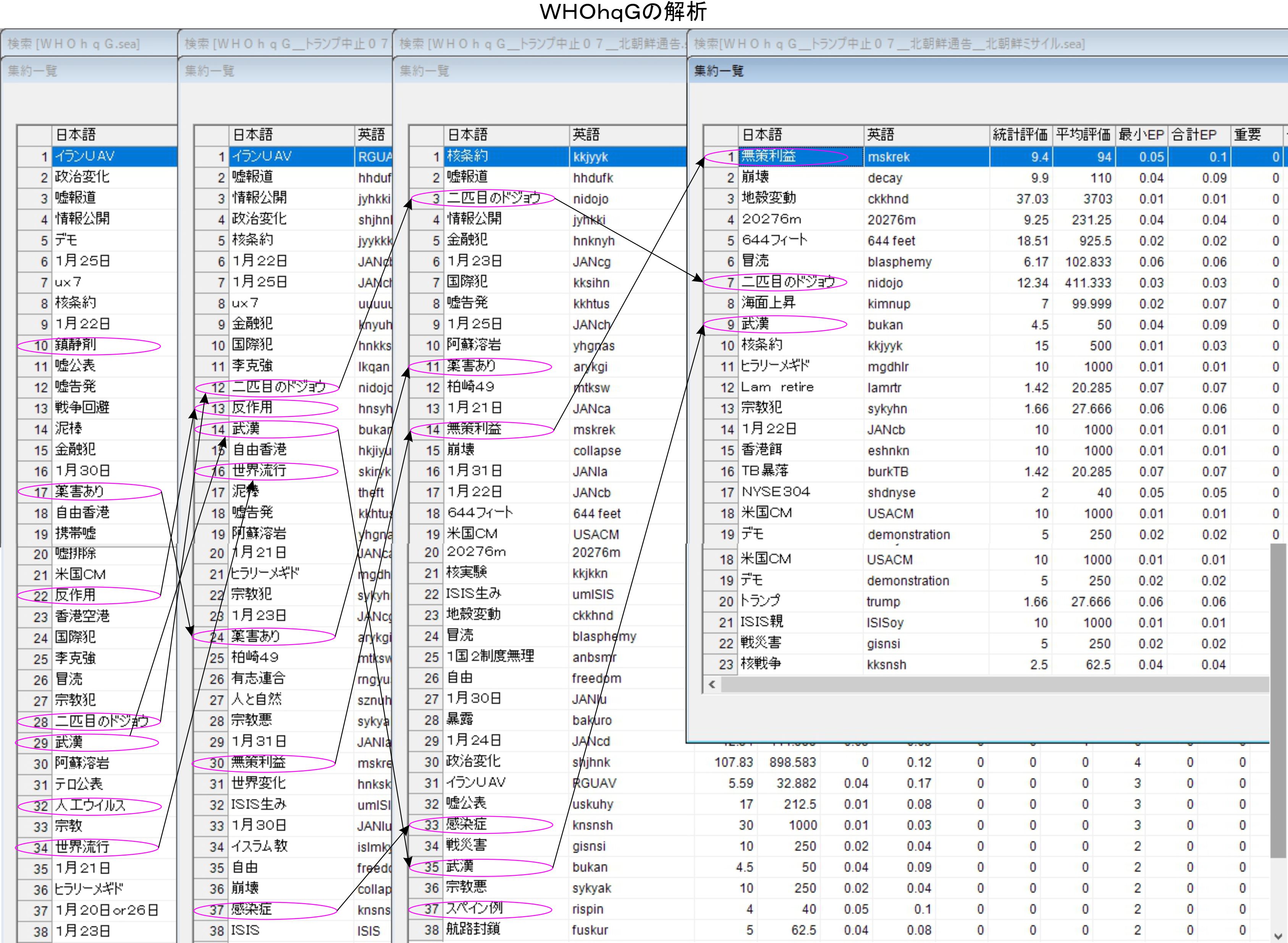 比較するWHOhqGですが、こちらにも工夫があります。2匹目のドジョウが上位を続けますし、武漢も上位です。無策利益が上昇して1番になる所は相変わらずすごいなと感じました。その他にスペイン例、薬害ありの上昇、鎮静剤や反作用など、注目すべき言葉が多くあるのでした。