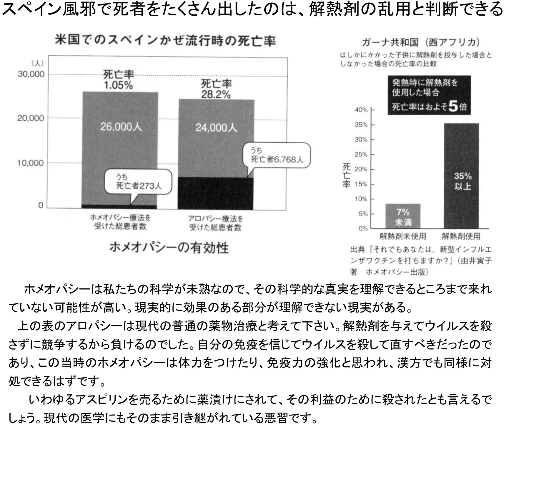 スペイン風邪の比較データーは、船瀬俊介氏の著書からのコピーです。元データーは内海聡氏の医学不要論他からの引用だと思います。内海聡氏は医師として、医療業界の闇を本に書いている方です。自分で確認する作業を時間の都合で見送るので、氏の言葉を信頼する所です。彼の言葉にはこちらの科学レベルとして、信頼が置けます。